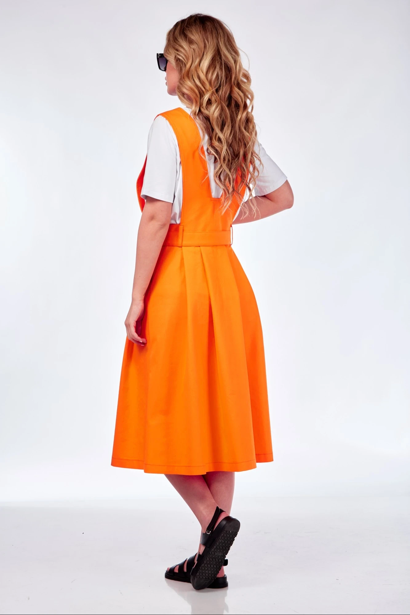 Сарафан из легкой джинсовой ткани, с широкими бретелями, карманами в боковых швах, отрезной по линии талии, юбка с мягкими складками, с застежкой на петли и пуговицы. Есть съемный пояс из основной ткани.