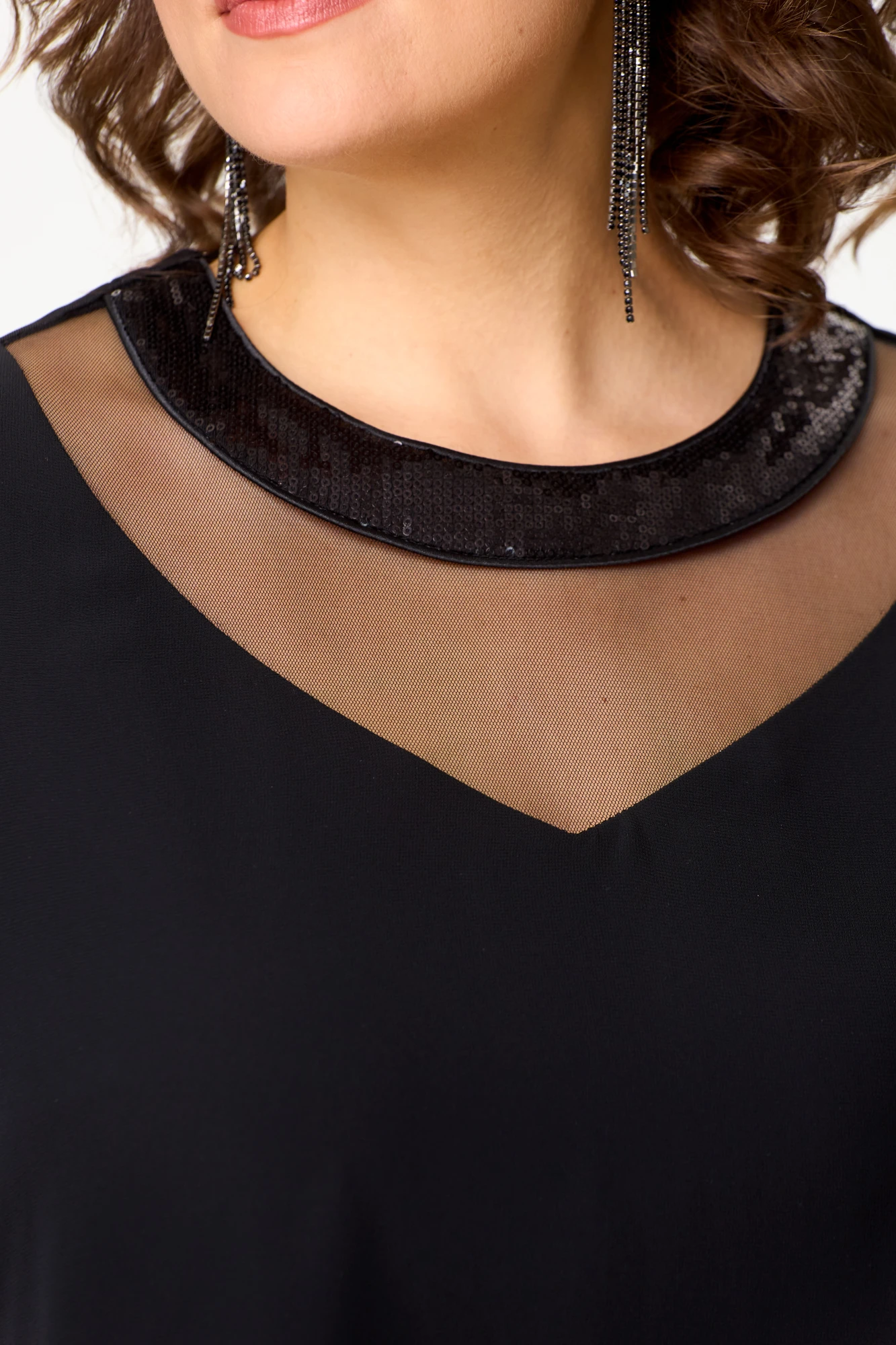 Стильное нарядное платье - для тех, кто предпочитает изысканность. Отделка из поеток по горловине и прозрачная вставка сетка в сочетании со струящейся отлетной частью переда делает образ неповторимым и элегантным. Рукав слегка расширенный к низу с декоративной вышивкой из паеток сделает Вас поистине роскошной! Платье прямого силуэта. В среднем шве спинки разрез.