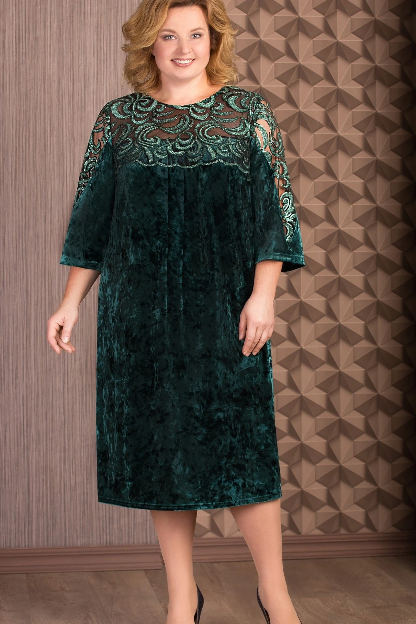 Платье женское нарядное из трикотажного эластичного бархата, без подкладки, с плечевыми накладками, без застежки. Платье свободного силуэта, с горловиной круглой формы, с втачными рукавами. Ткань бархат мокрый и кружево паетки. Перед с двойной кокеткой (нижняя – из сетки, верхняя – из ажурного кружева с пайеткам и фестончатым краем), со сборкой по линии соединения нижней части переда и кокетки. Спинка без вытачек. Длина по центру спинки 107 см. Рукава одношовные, прямые, длиной ¾, с V-образной вставкой из ажурного кружева. Длина рукавов 45 см. Горловина по переду и спинке обтачная.