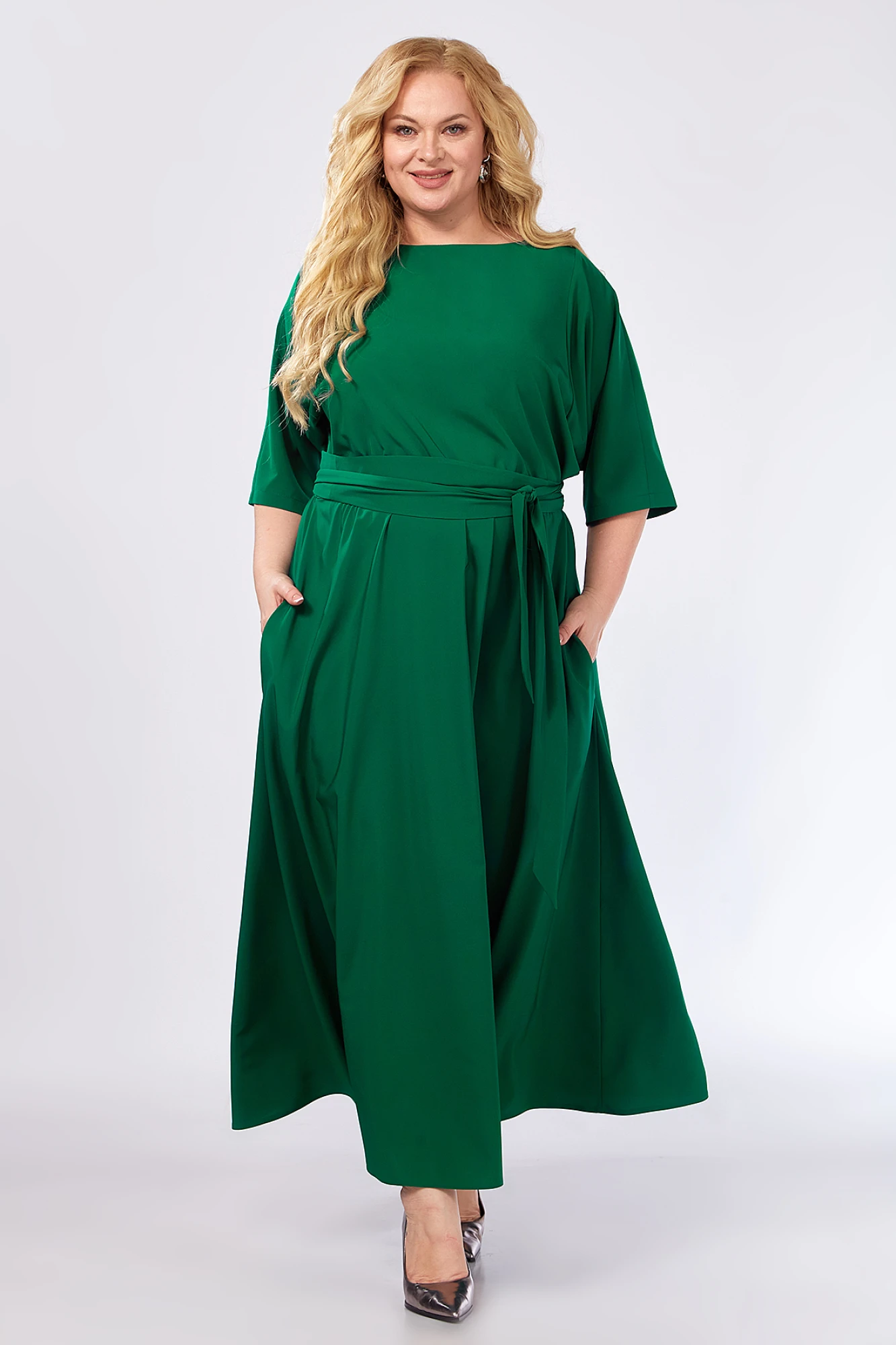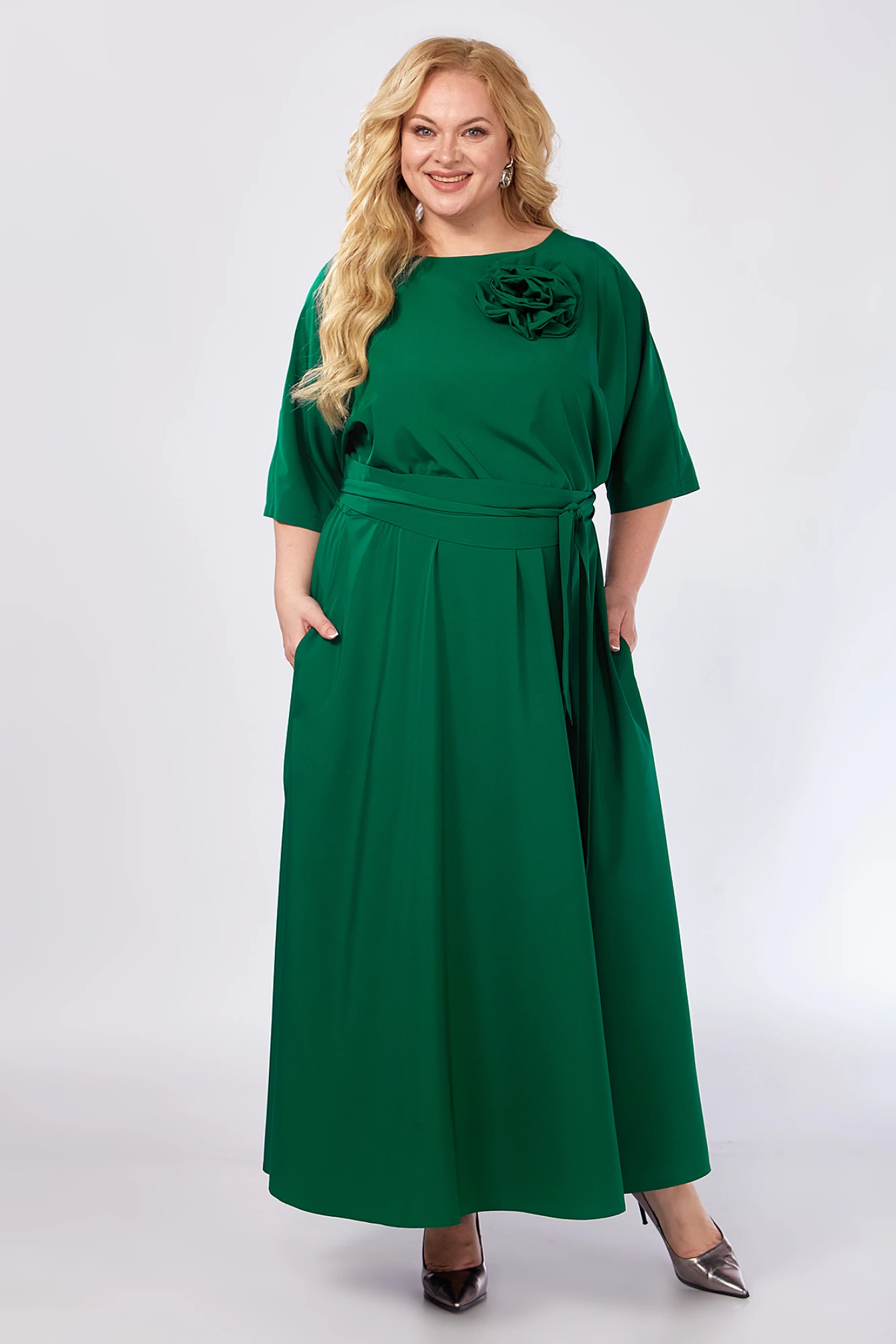 Приятное к телу женское вечернее платье из легкой плательной ткани без подкладки. Женственное и элегантное, оно украсит Вас по случаю любого праздничного торжества. Изделие красиво драпируется, не электризуется. Платье отрезное по талии, которая собрана на резинку для идеальной посадки практически на любую фигуру. Вырез горловины - лодочка - имеет достаточную свободу и застегивается на петлю и пуговицу по спинке. Рукава длиной 3/4. В боковых швах обработаны карманы. Низ - четверть солнца длины макси (в пол). В комплекте с платьем идет съемный цветок, а также нарядный широкий пояс-кушак, которым можно подчеркнуть изящный силуэт и прикрыть животик. Элегантное платье обязательно должно быть в гардеробе современной женщины! Создавайте с ним романтичные образы на мероприятия по случаю любых праздников!