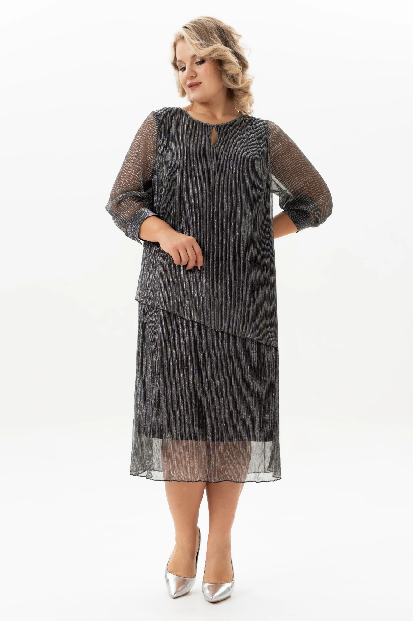 Это итальянское платье- имитация костюма нарядного стиля больших размеров станет отличным выбором для тех, кто ценит элегантность и стиль. Платье сочетает в себе комфорт и долговечность. Ткань "плиссе" придает изделию оригинальную рельефную текстуру, которая делает его особенно привлекательным. Основная особенность этого платья — силуэт в виде трапеции, который подходит для разных типов фигур, а также каплевидный декор по горловине полочки. Длина юбки — миди. Платье предназначено для женщин плюс сайз и станет идеальным выбором для вечерних мероприятий, новогодних праздников, свадеб или юбилеев. Благодаря универсальному дизайну ее можно сочетать с различными нарядами. Это отличный подарок для жены, мамы, сестры или девушки. Платье украшено брошей-цветком и съемным поясом, которая добавляет элегантности и шарма, и ее можно заменить на другие аксессуары, адаптируя наряд под разные события и настроения. Легкая трикотажная подкладка делает его еще более комфортным, а рукава 3/4 и рубашечный манжет с застежкой на петлю и пуговицу делают платье подходящим для большинства женщин. Выбирая это платье больших размеров , Вы получаете не только стильное и элегантное платье, но и качественное удобное изделие, которое скрывает все неровности фигуры и будет Вашим верным спутником на любых праздниках .