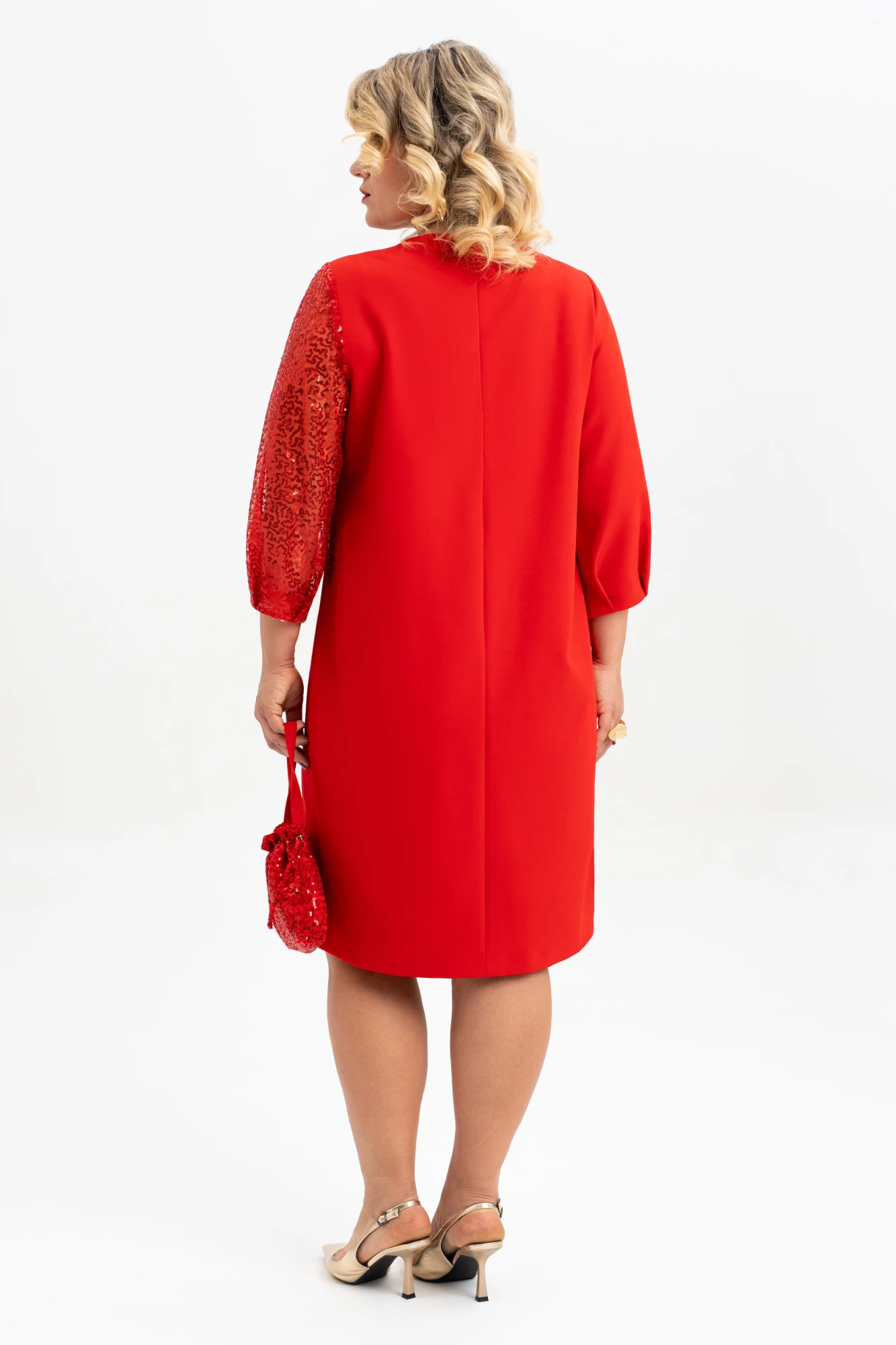 Нарядное платье больших размеров от бренда Альгранда представляет собой идеальный выбор для тех, кто ищет праздничный наряд с уникальным дизайном и комфортом. Шикарное нарядное платье с ассиметричными рукавами станет красивым дополнением элегантного женственного образа. Прямой крой платья- футляр подчеркнёт Вашу фигуру, делая её ещё более привлекательной. Оно выполнена из плательной ткани и сетки расшитой пайетками. Длина изделия доходит до середины голени, приоткрывая линию ног. Благодаря такой особенности дизайна платье будет хорошо смотреться в сочетании с обувью на каблуке и на низком ходу. По переду платья есть нагрудные выточка от проймы, фигурная кокетка, небольшой разрез в боковом шве. Спинка платья со средним швом, в который вставляется молния. Вырез горловины круглый. Воздушный втачной рукав длиной 3/4, по низу которого есть складки. Подойдёт для посещения деловых мероприятий и торжественных событий. В комплекте к платью прилагается нарядная сумочка .Эта маленькая сумочка придаёт завершённость образу. Выполненная в блестящем дизайне, она привлекает внимание и добавляет нотку роскоши. Наступает год Огненной Лошади и платье прямого кроя с сумочкой красного цвета принесет Вам удачу в следующем году!