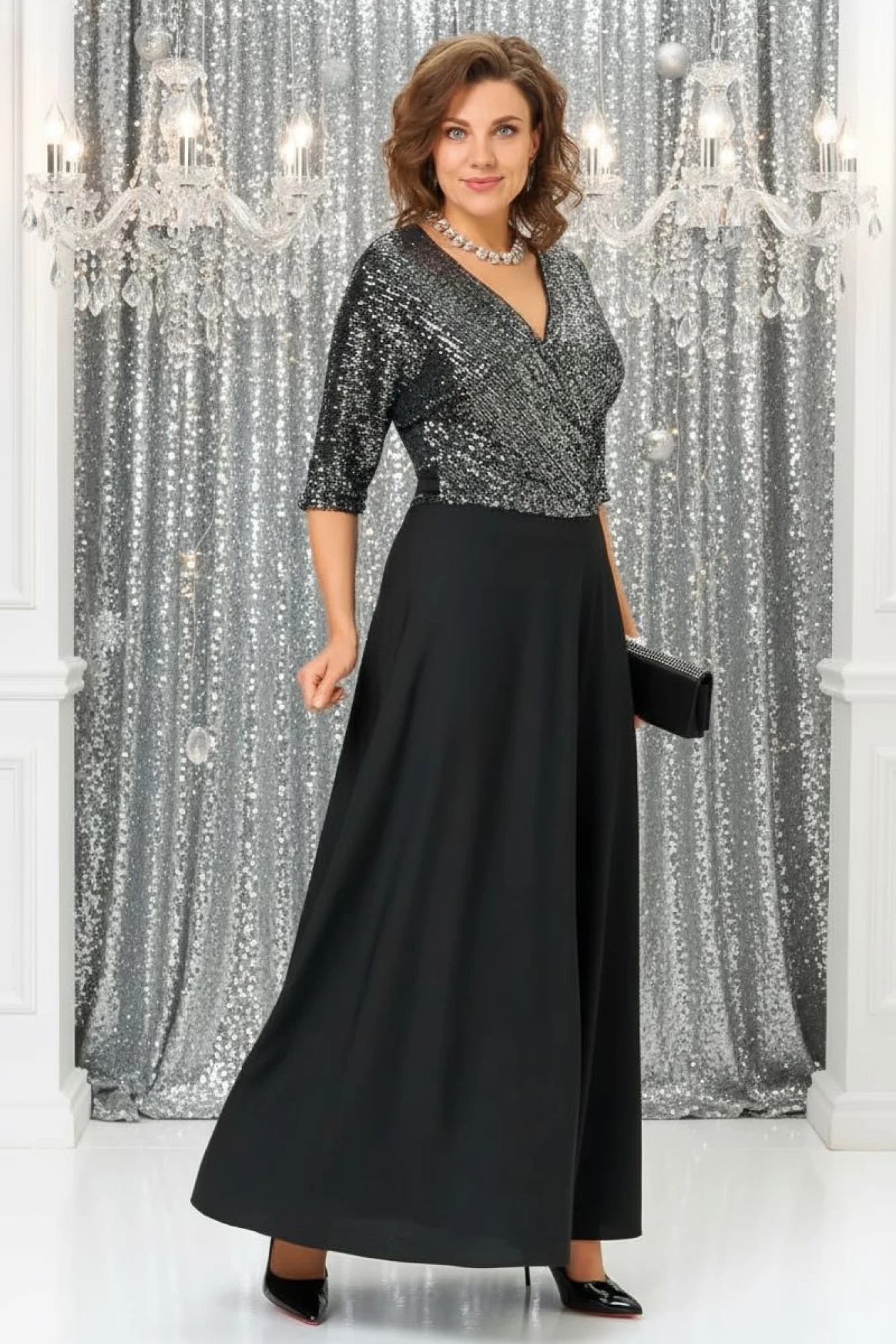Элегантное женское платье из двух видов ткани: пайетки и текстиль- иделаный выбор на Новый год и другие торжественные мароприятия. Отрезное по линии талии. Благодаря своему крою прекрасно будет смотреться на любой фигуре, скрывая недостатки. Юбка-солнце-клеш. Верхняя часть со свободным рукавом "летучая мышь", на подкладке из стрейчевой сетки. Благодаря этому платье не колется. В правом боковом шве лифа - отверствие для пояса,который протягивается и завязывается по спинке. Прилегание платья регулируется запахом и поясом. Длина по спинке: верхняя часть -40см, юбка -106см. Длина рукава о горловины - 46 см.
