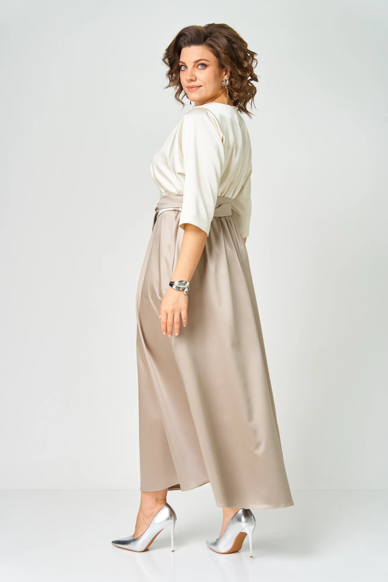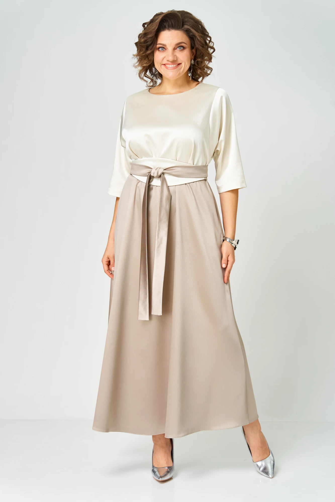 Платье выполнено из однотонной ткани с атласным эффектом в сочетании двух цветов. Платье длинной макси с акцентом в области талии в виде съемного пояса "кушак". Платье отрезное по линии талии. Полочка с горловиной овальной формы. Спинка со средним швом, в верхней части которого обработана капля-разрез с застежкой на навесную петлю и пуговицу. Рукав одношовный длиной 3/4. Юбка формы колокол. В боковых швах юбки обработаны карманы. По талии платье с эластичной тесьмой. В боковых швах лифа обработаны шлёвки, через которые продевается пояс-кушак