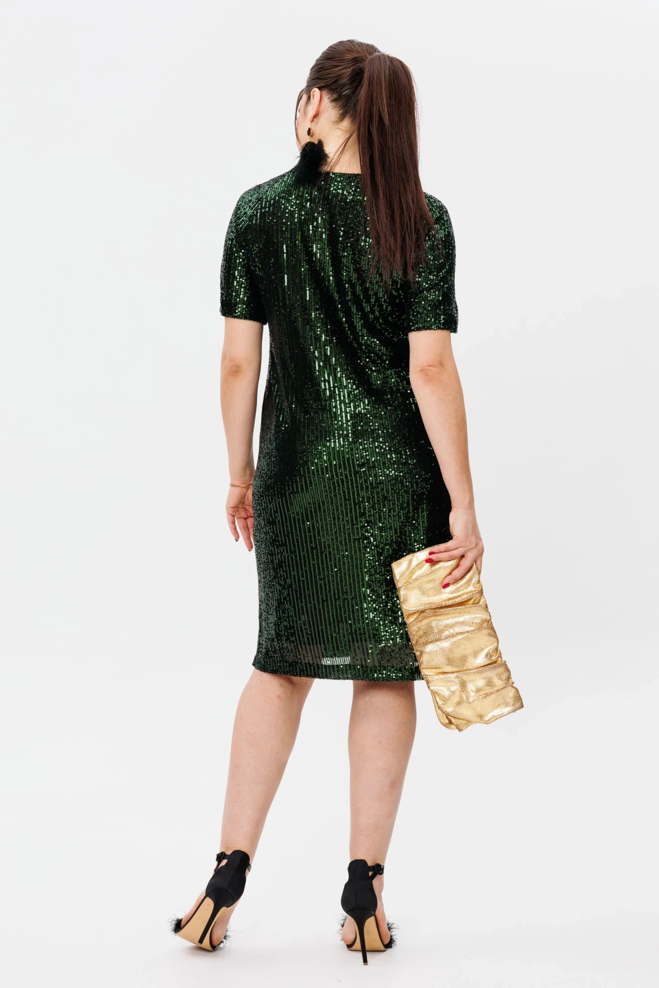 Это не просто платье в пайетках – это исключительная комбинация элегантности и современного шика. Подчеркните свою утонченность и уверенность в себе с его идеальной длиной, v-образным вырезом и безупречным силуэтом.