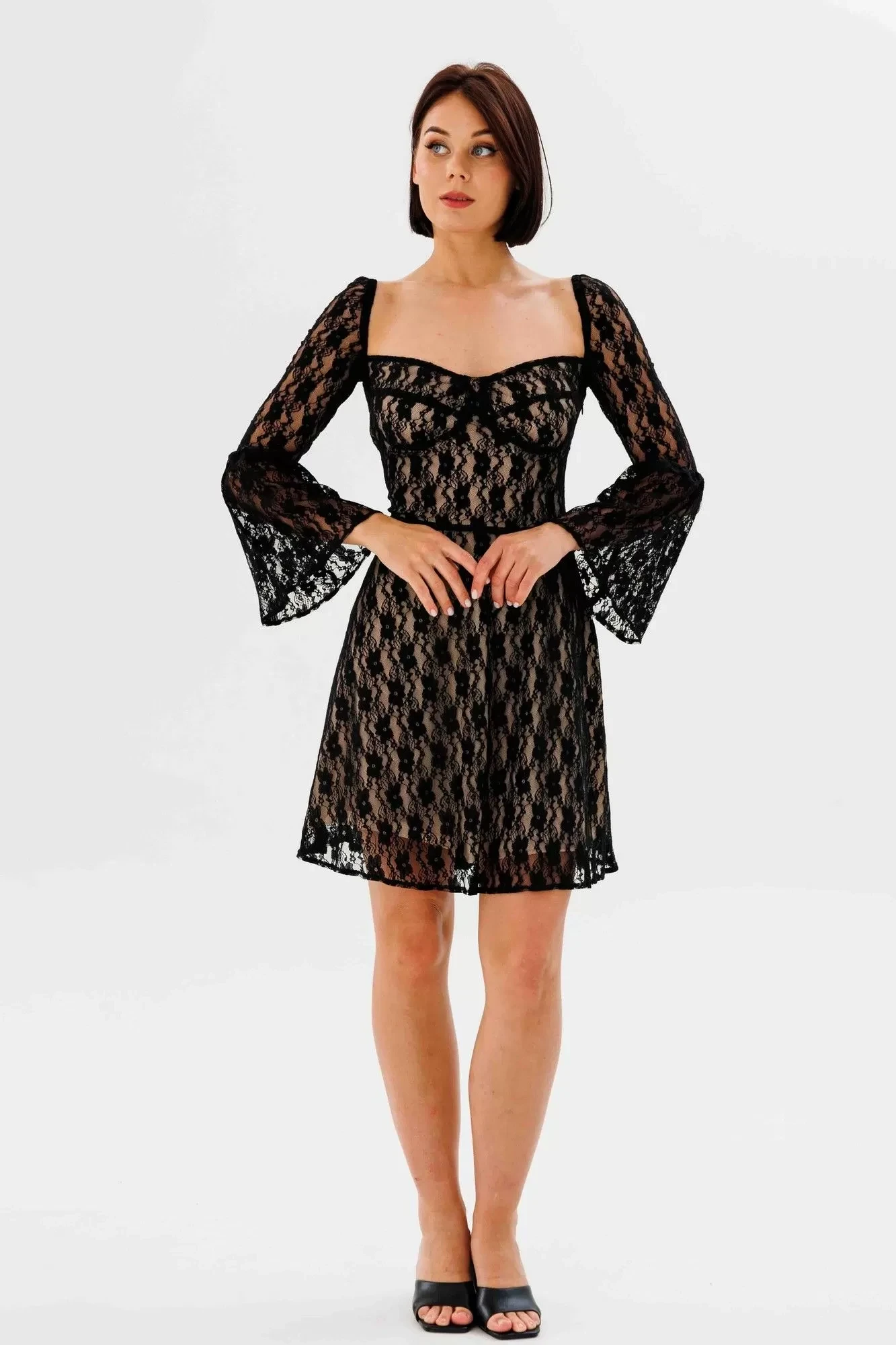 Платье в длине мини, выполнено из эластичного гипюра, обработано трикотажной эластичной подкладкой телесного цвета. Лиф отрезной по т линии талии. Обработаны чашки. Верх рукава собран на резинку. Рукав прямой до линии локтевого сгиба, имеет притачную деталь в форме клеша. Застежка - потаная молния в боковом шве. Юбка широкая по форме полукруг.