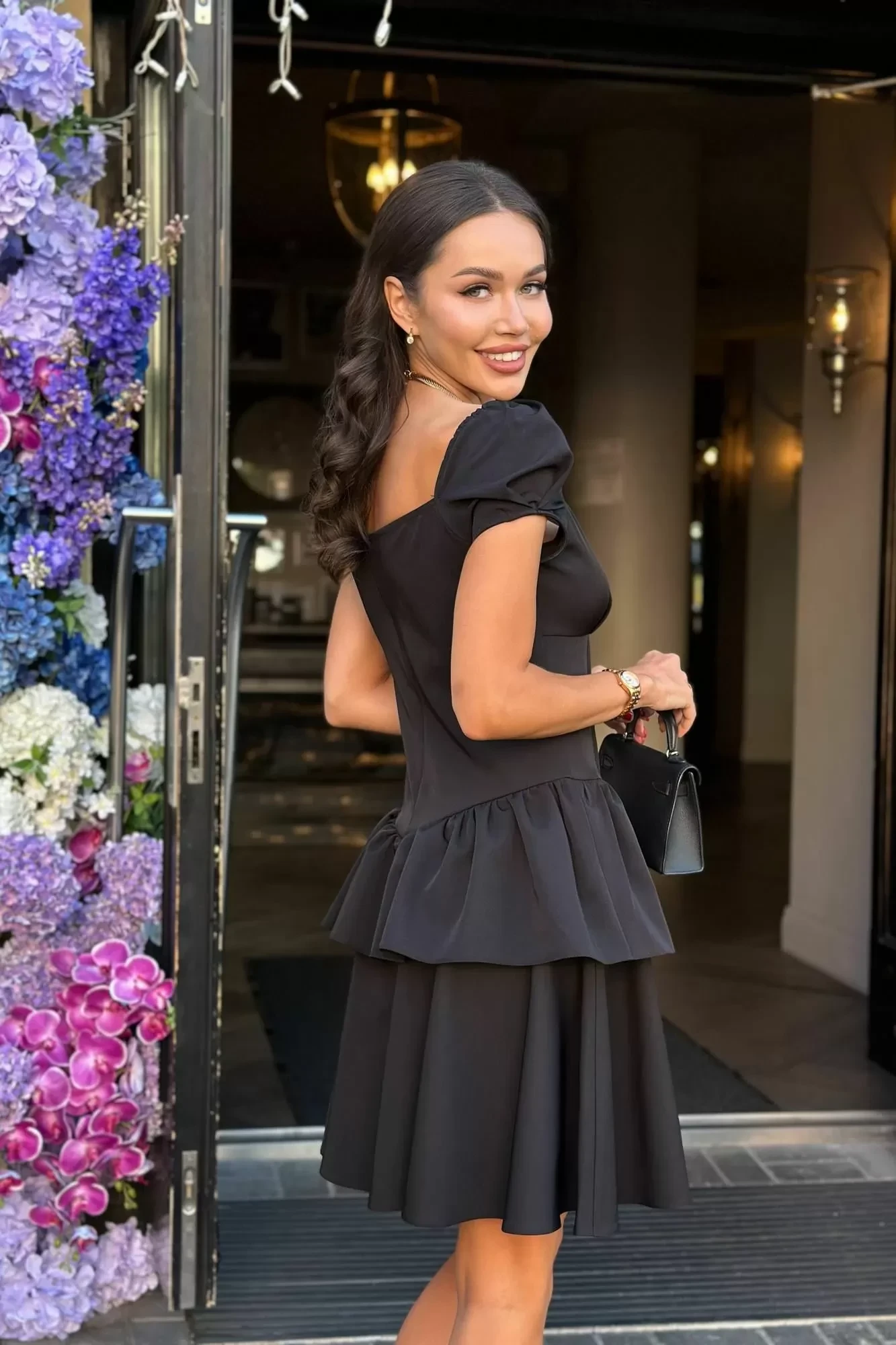 Платье в длине мини. Лиф платья прилегающего силуэта, обработан талиевыми вытачки. Юбка платья пышная, обработаны 2 ярусами воланов. Застёжка - потайная молния по центру спинки. Рука короткий, присборен на резинку, может надеваться на плечо и на предплечье для более игривого образа.