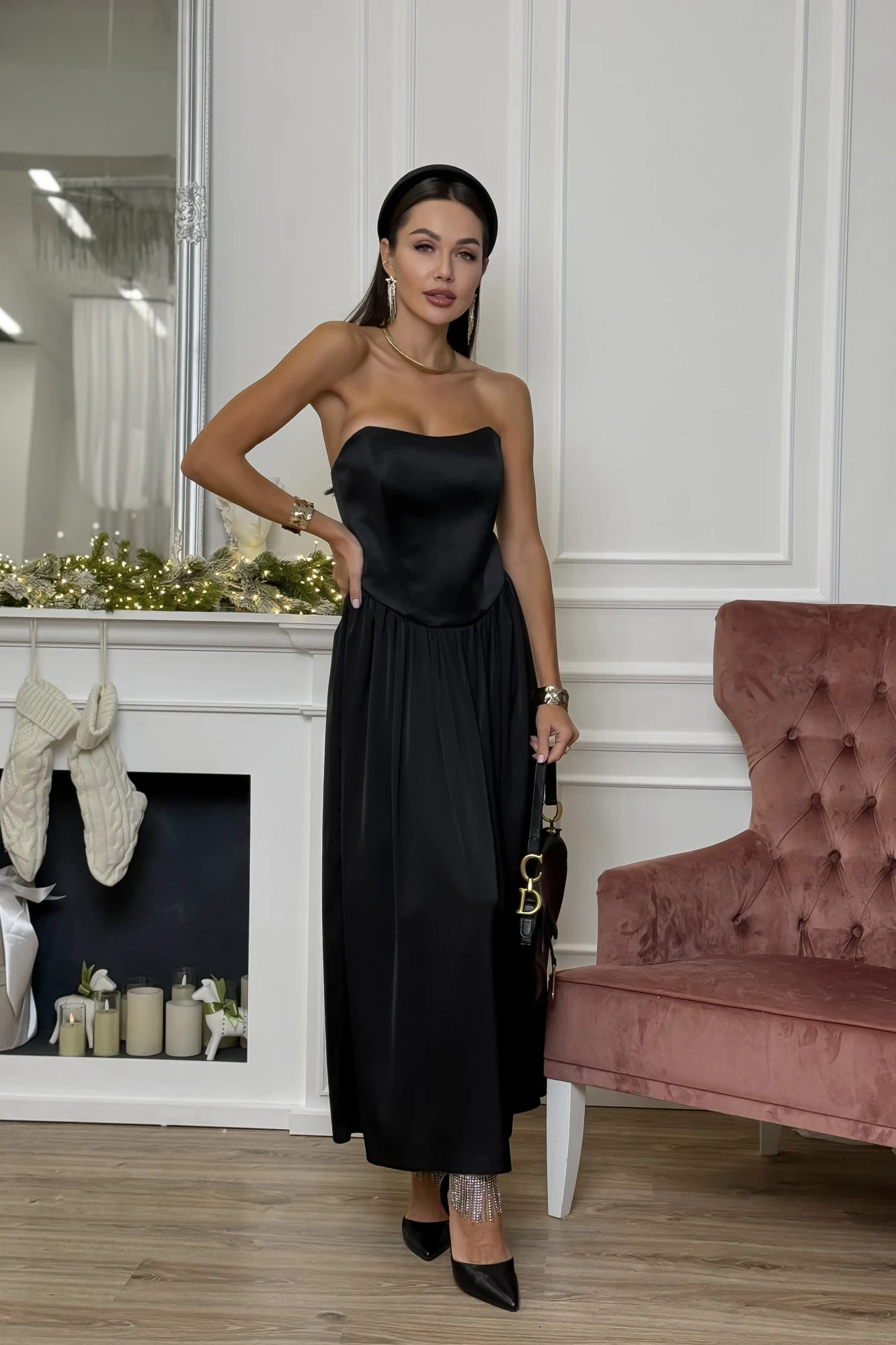 Классическое вечернее платье в длине макси. Лиф обработан по форме корсета, ддля фиксации формы обработан регилинами, застёжка - потайная молния по центру спинки в цвет изделия., Юбка притачная, выполнена из искуственного шёлка
