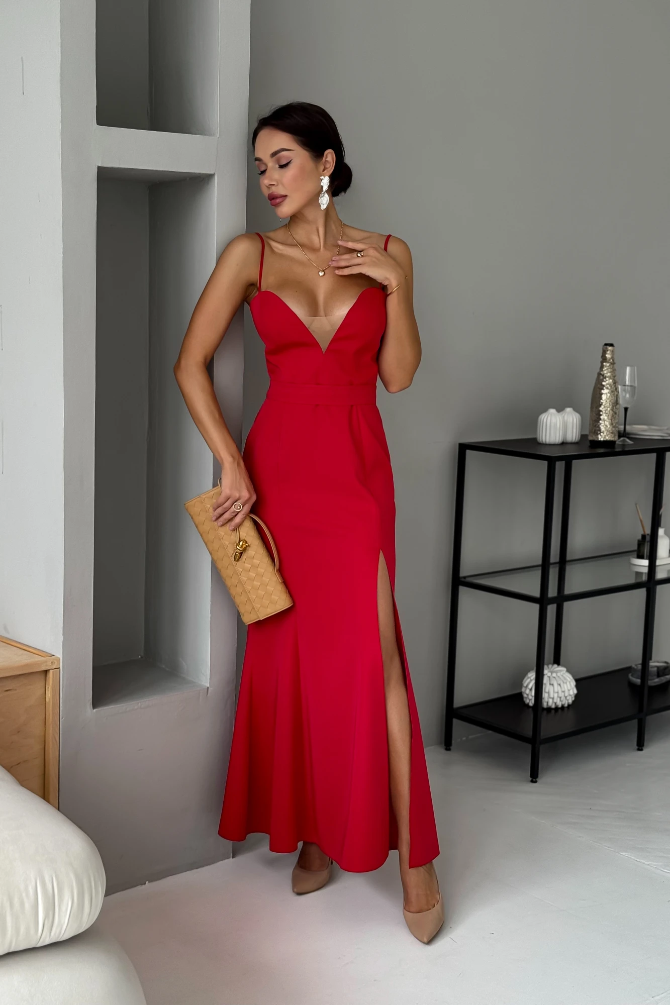 Спинка задекорированна кокетливой шнуровкой для регулировки по фигуре. Застежка на потайную молнию по спинке юбки в среднем шве. Также платье дополнено разрезом по левой ноге.
