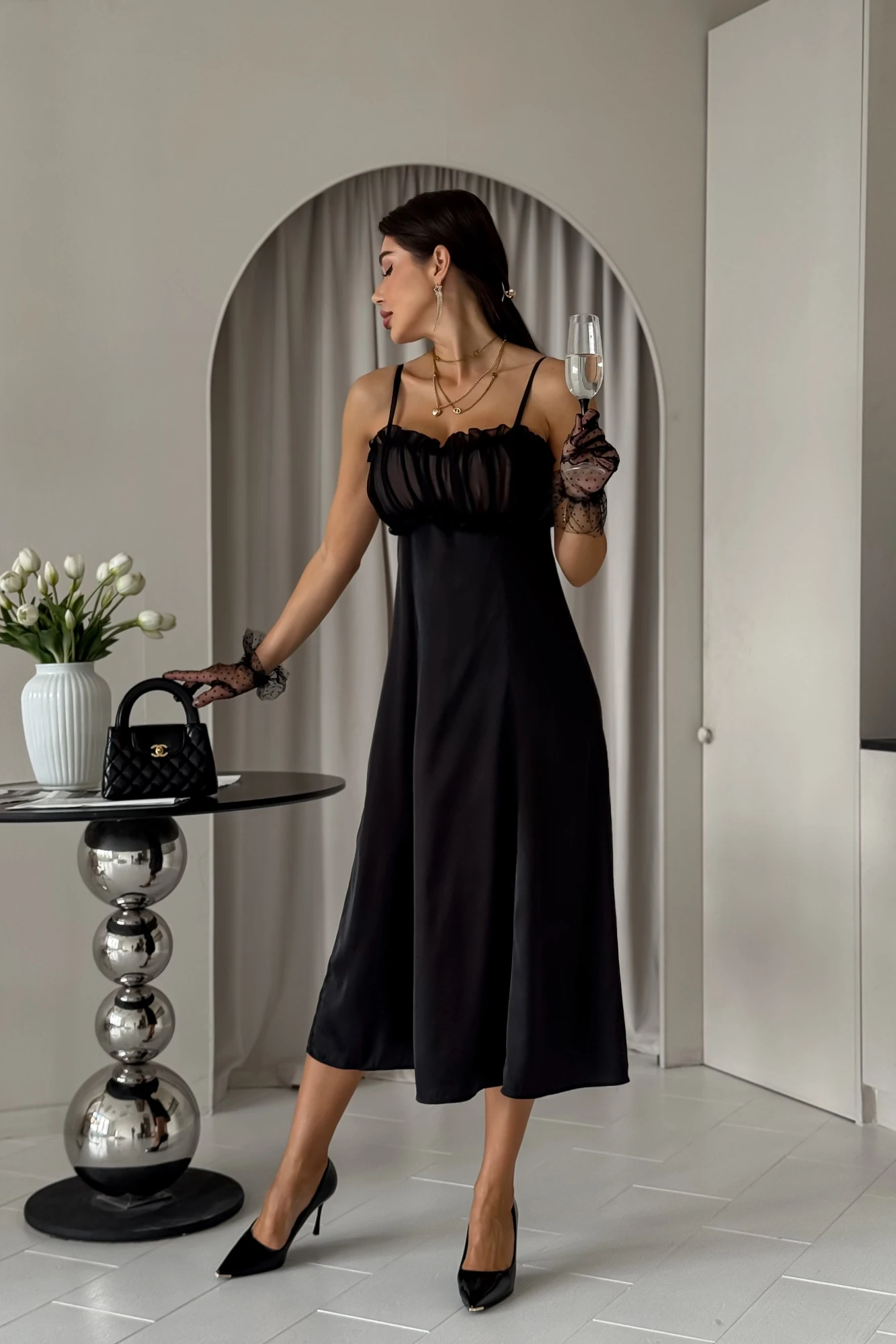 Ультра женственное платье из лёгкой атласной ткани. Подчеркнутая линия груди в виде чашечек с изящными шифоновыми вставками. Тонкие атласные лямки. Застежка на потайную молнию. Платье подчеркивает силуэт. Длина миди. Идеальный вариант для свидания и особых случаев.