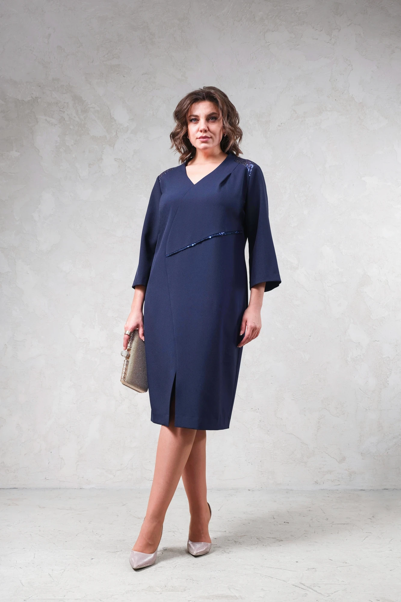 "Платье женское, нарядное. Полуприлегающего силуэта. Перед платья с V-образным вырезом, декоративным подрезом по линии талии, декорированный вставкой из пайеток.