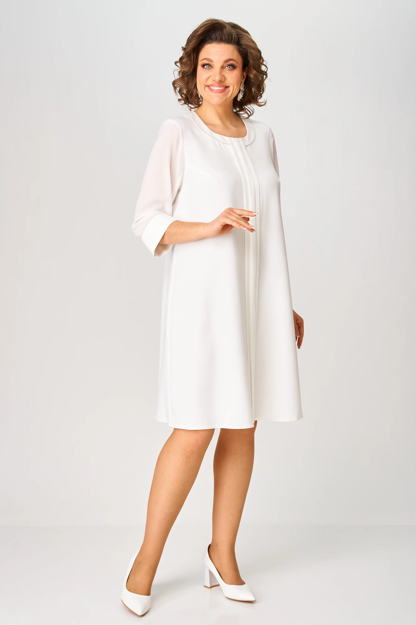 Платье женское А-силуэта, выполнено из плательной ткани в сочетании с шифоном. Горловина платья округлой формы, с планкой, которая декорирована отделочной тесьмой. По центру полочки выполнены складки, которые зрительно вытягивают силуэт. Есть нагрудные выточки, выходящие из проймы. Рукав втачной, одношовный из шифона. Низ рукава на притачной манжете с декоративной тесьмой. Спинка платья разрезная с «капелькой» и застежкой на навесную петлю и пуговицу. Платья прекрасно подходит для корпоративов, новогодних праздников и других торжеств. Платье скроет недостатки и придаст нарядный и элегантный вид.