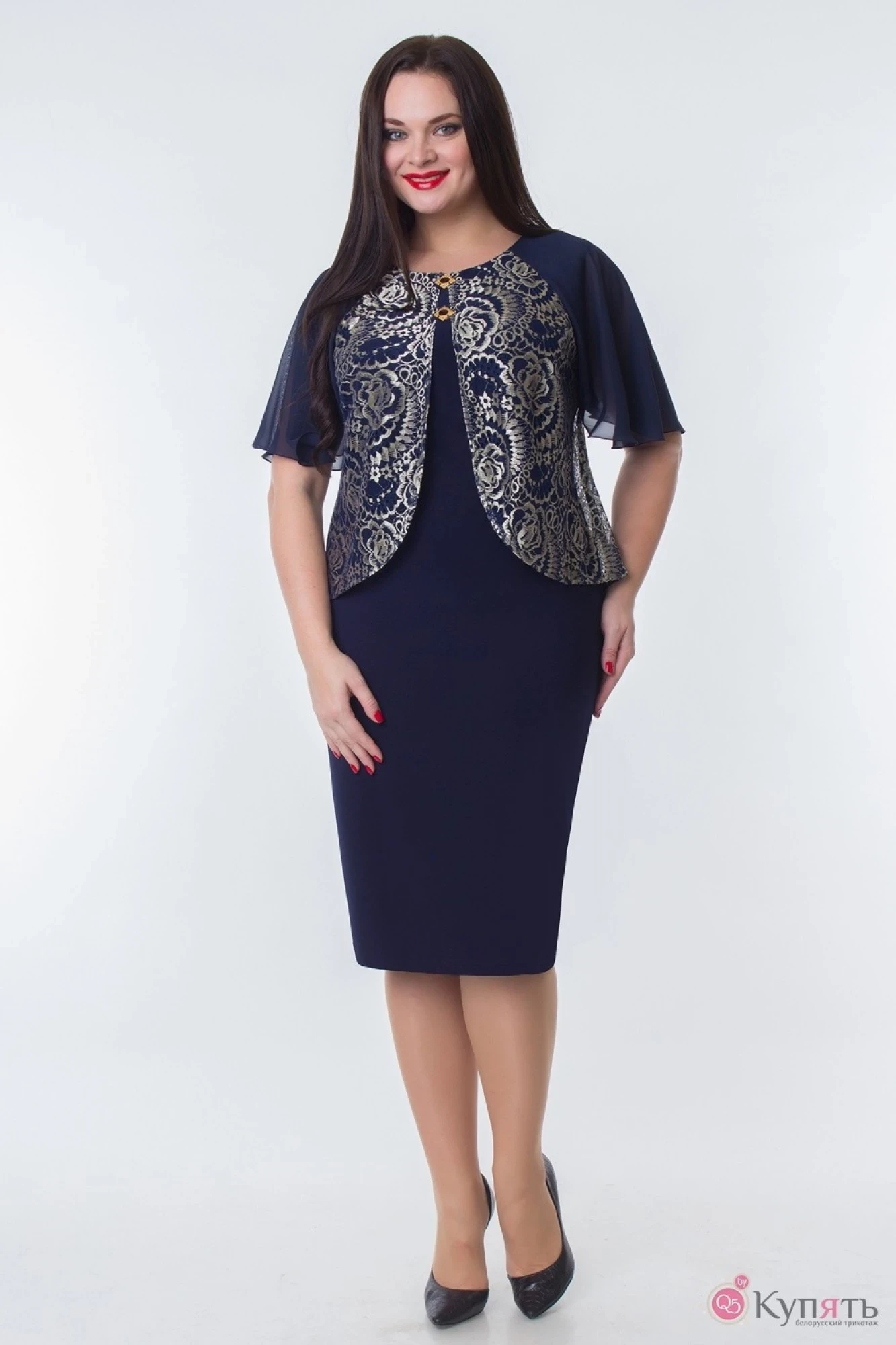 Элегантное женское платье из трикотажного волокна с содержанием эластана полуприлегающего силуэта.Сверху платья эмитация накитки из кружева.Рукав короткий из шифона типа *колокол*. Горловина круглая.