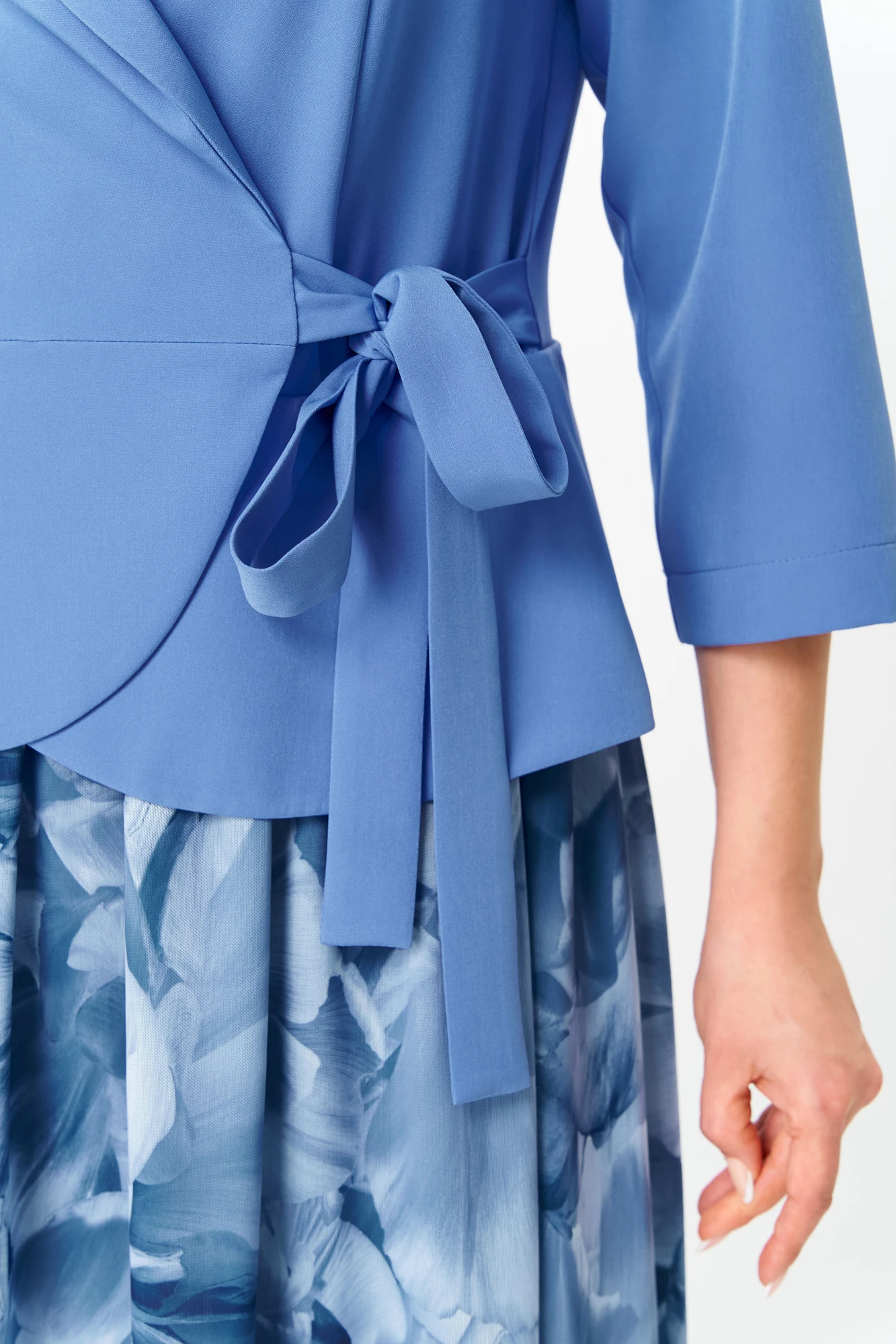 Платье полуприлегающего силуэта, верх жакетного типа с запахом. Юбка расширенная со сборкой по талии, на подкладке.