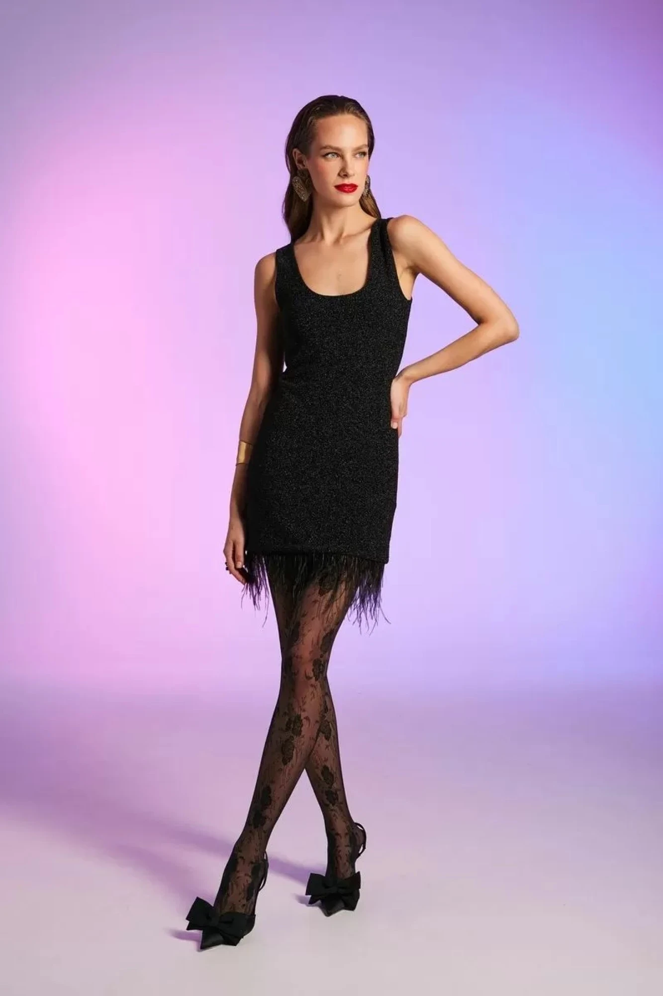 Платье-мини из мягкого трикотажного полотна бистрейч, с искрящейся креповой поверхностью, прилегающего силуэта, без рукавов. Горловина округлой формы, конструкция платья и эластичность полотна позволяет самому выбирать глубину горловины по переду и спинке. Платье на тонкой трикотажной подкладке. По низу платья декоративный элемент – тесьма с тонкими перьями.