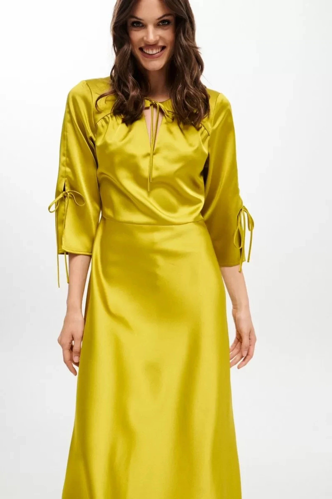 Платье женское, приталенного силуэта, длиной миди из костюмно-плательной ткани. Отрезное по линии талии. Перед с фигурными кокетками и фигурным вырезом горловины, в шве кокетки сборка. В выступах кокетки по горловине имеются завязки. Лиф и юбка спинки с талиевыми вытачками. В левом боковом шве потайная застежка молния. Рукав двухшовный, втачной, три четверти. В локтевом шве рукава декоративный разрез с завязками. Вырез горловины переда V-образный.