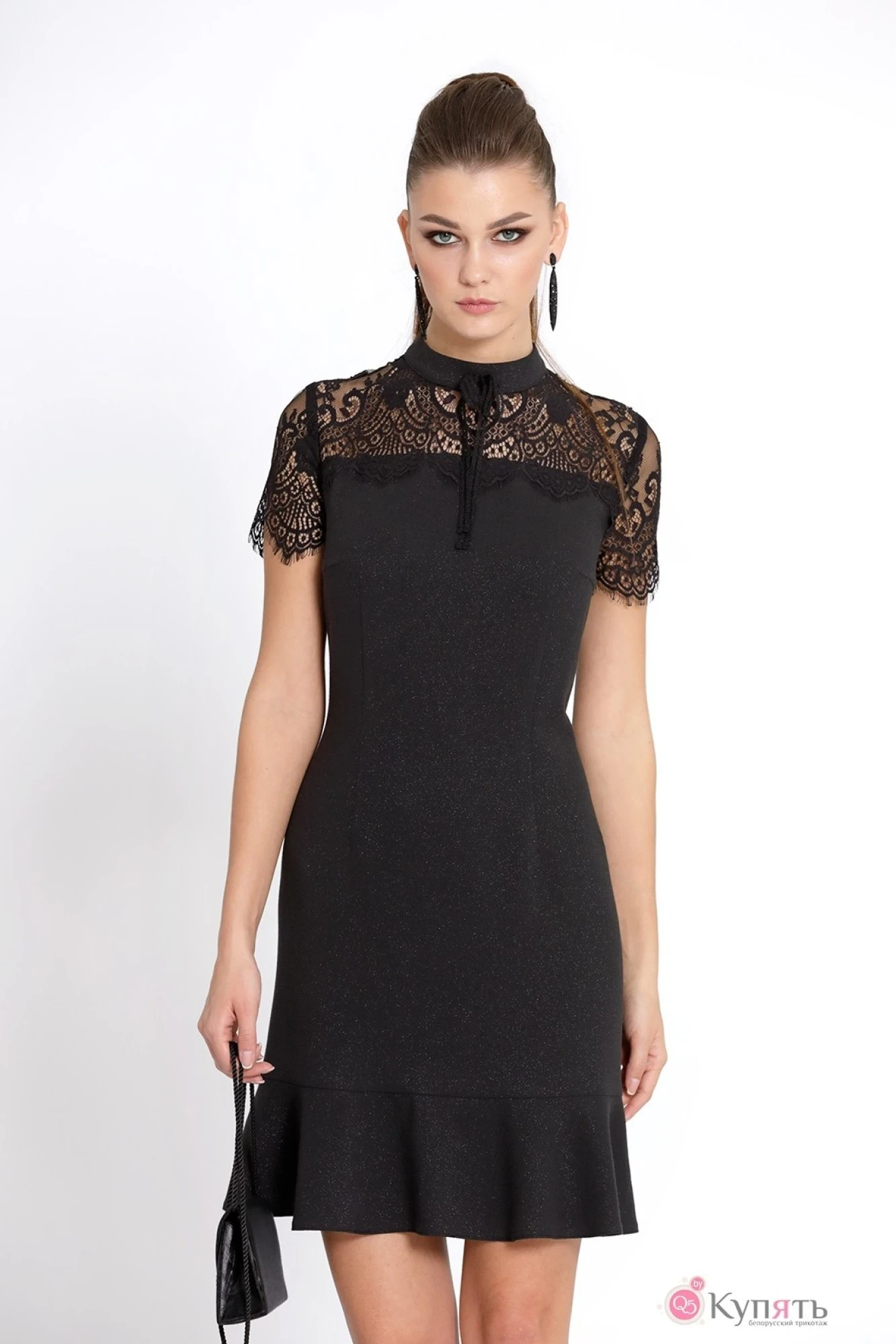 Платье выполнено из плательной ткани прилегающего силуэта, на кокетке по переду и спинке из кружева. Воротник-стойка из основной ткани, застежка в среднем шве спинки на потайную молнию. Рукав короткий из кружева. По низу платья - волан из основной ткани.