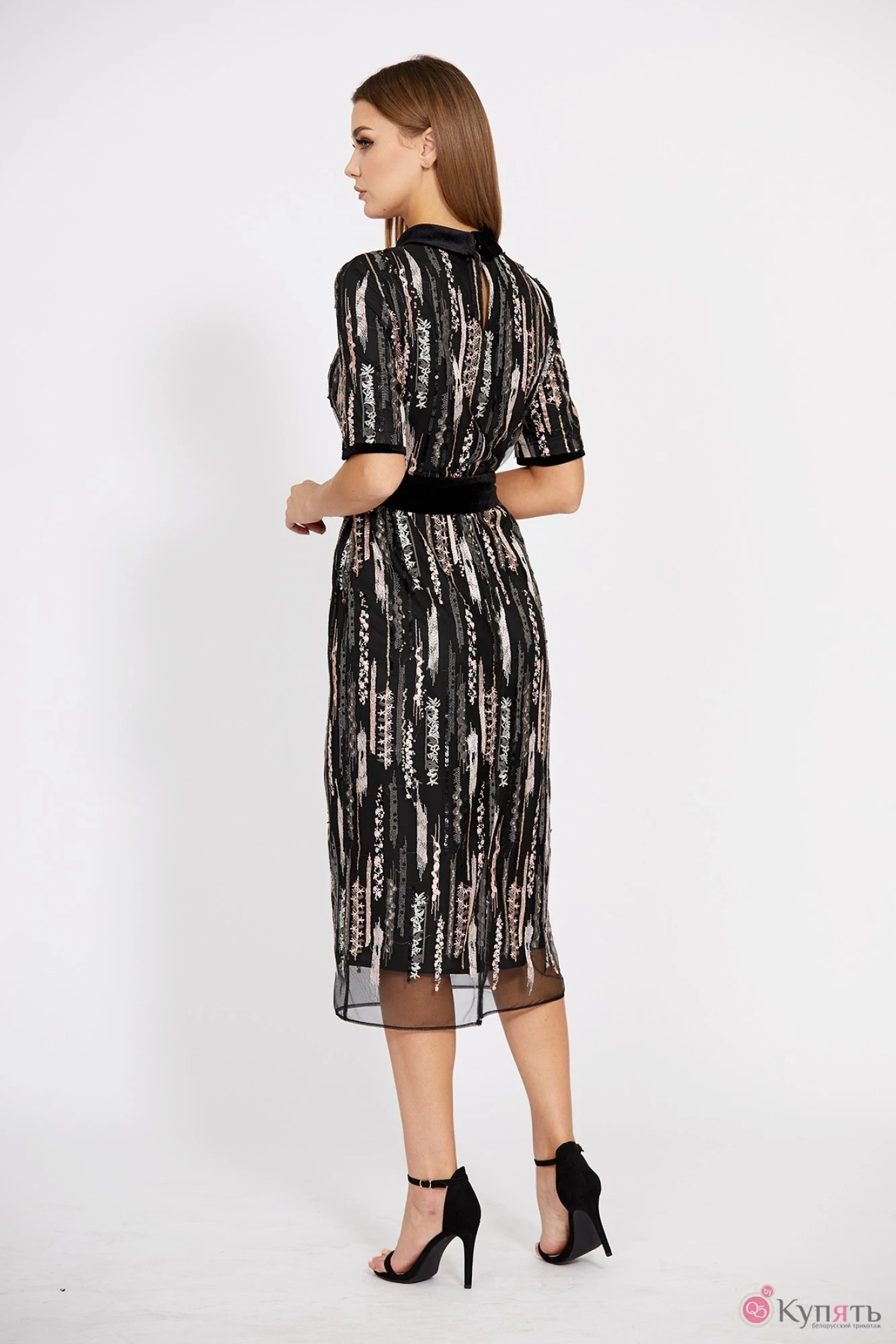 Платье полуприлегающего силуэта, длиной до середины икры, из плательно-блузочной ткани с вышивкой на сетке. Перед цельный с нагрудными вытачками из боковых швов. Платье без молнии. Воротник на стойке с застежкой на 2 пуговицы сзади. Рукав втачной, одношовный, выше локтя, с притачной манжетой по низу. Платье на отлетной по низу подкладке из стрейчевого атласа. В комплект входит съемный пояс с обтяжной пряжкой.