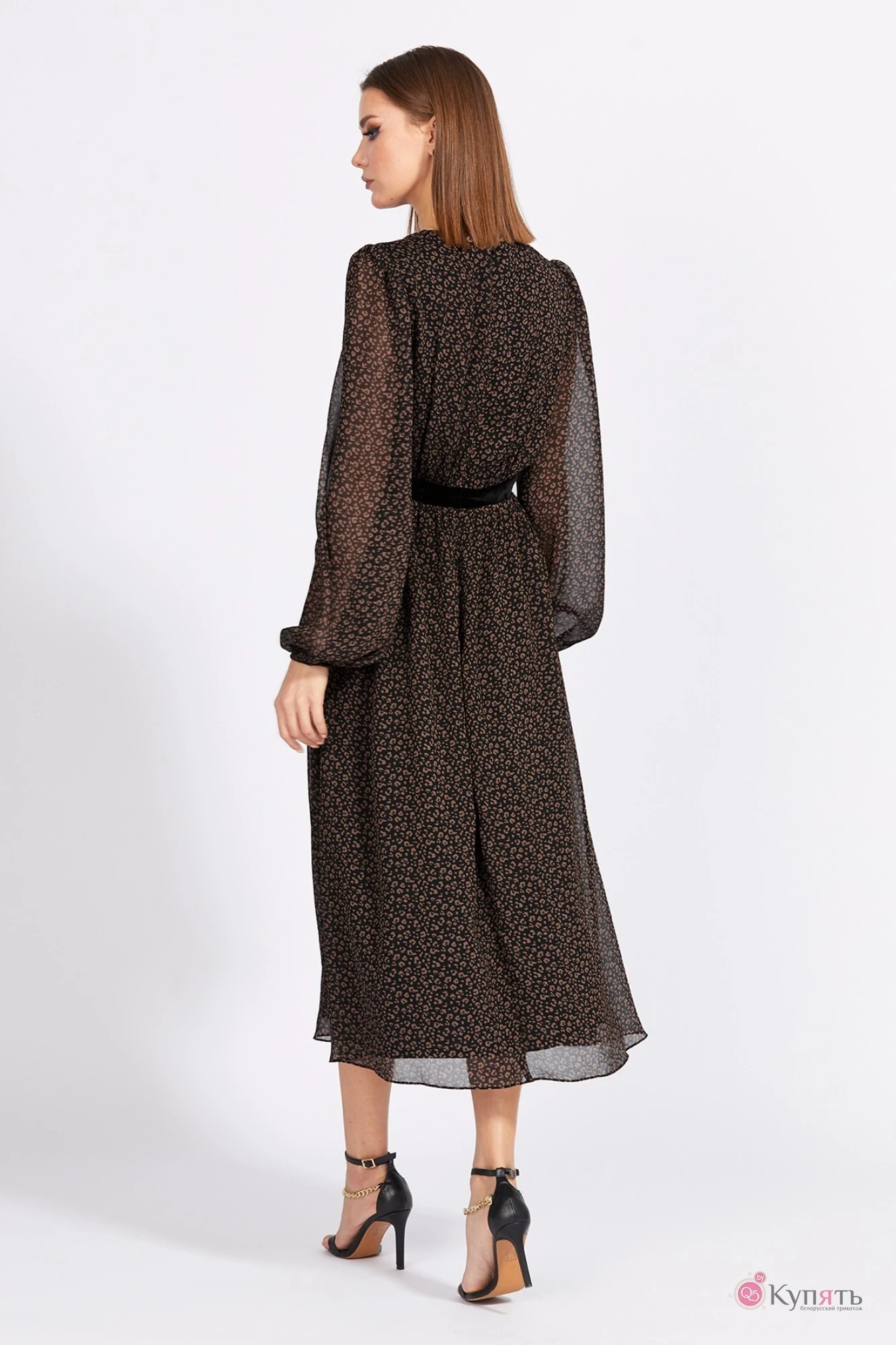 "Платье выполнено из шифона с принтом. Платье Х-образного силуэта, отрезное по линии талии, длиной миди. Спереди складки от плечевых швов и сборка по линии талии. Застежка в среднем шве спинки на потайную молнию. Горловина округлой формы, обработана окантовкой. Плечевой шов заужен. Рукав втачной, одношовный, со сборкой по окату. Низ рукава присборен на эластичную тесьму. Юбка расширена к низу. Пояс втачной, фигурной формы, выполнен из велюра. Лиф и юбка платья на трикотажной подкладке.