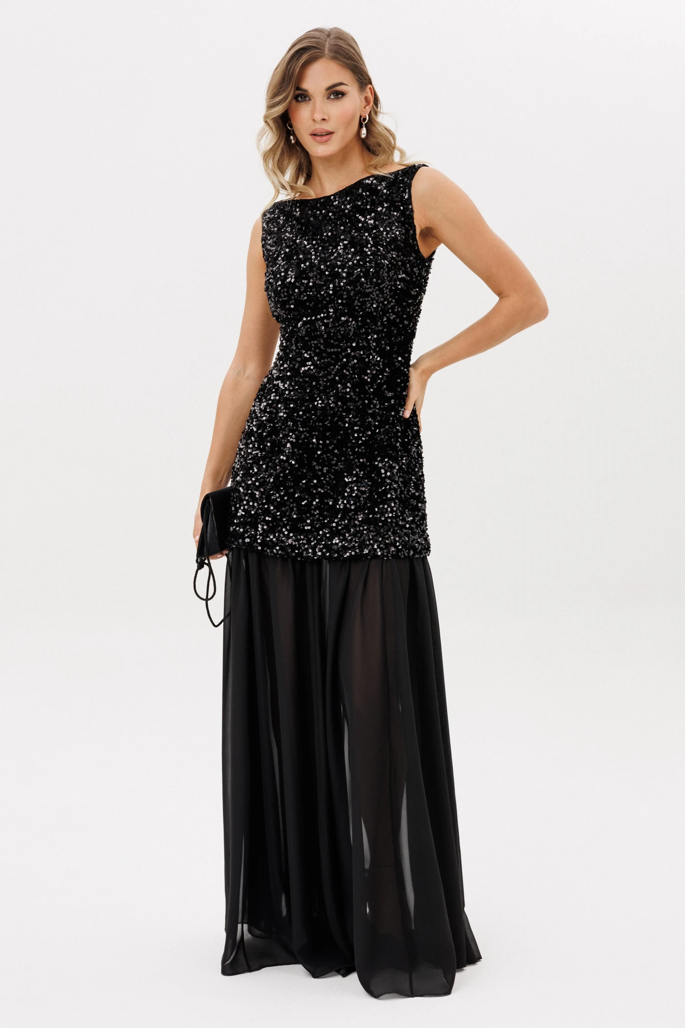 Платье выполнено из барахата с пайетками. Платье Х-образного силуэта, длиной в пол. Верх платья выполнен в виде приталенного платья длиной ниже линии бедер. Застежка на молнию с металлическими звеньями сзади в среднем шве спинки. Плечевой шов заужен. Горловина формы ""лодочка"". Нижняя часть платья выполнена из шифона и состоит из 8 клиньев. Верх платья на притачной по низу подкладке.