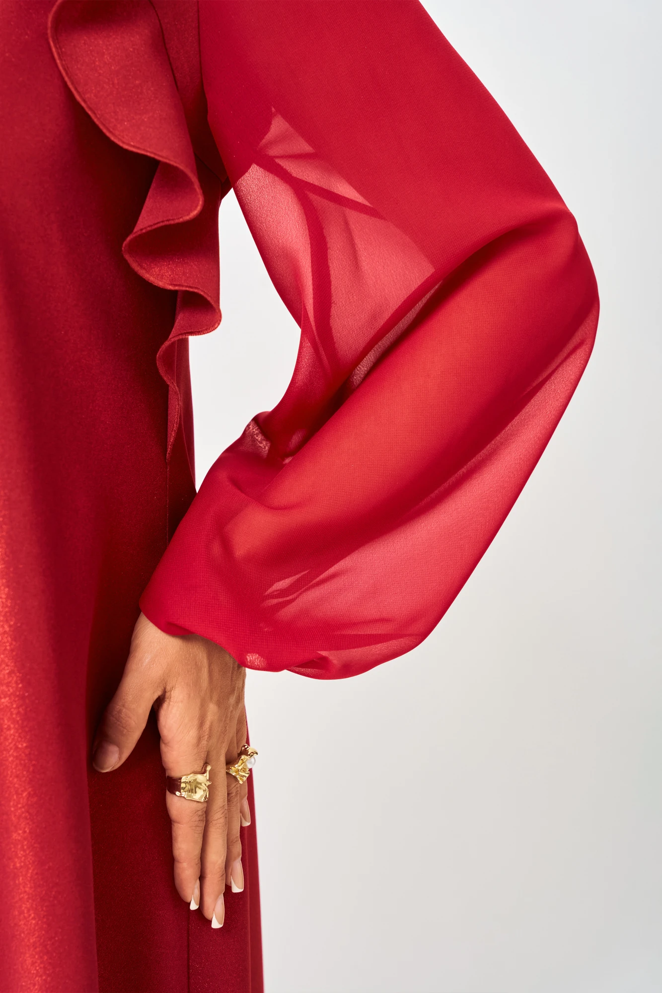 Платье красивое нарядное женское шикарное А-образного силуэта расширенное к низу выполнено из плательной ткани пропитанной блестками (не осыпаются) в сочетании с шифоном. Вырез горловины фигурный на обтачке, рукав втачной из шифона по низу на резинке. По полочке кокетки с притачным воланом входящим в боковой шов. В боковых швах обработаны небольшие разрезы.