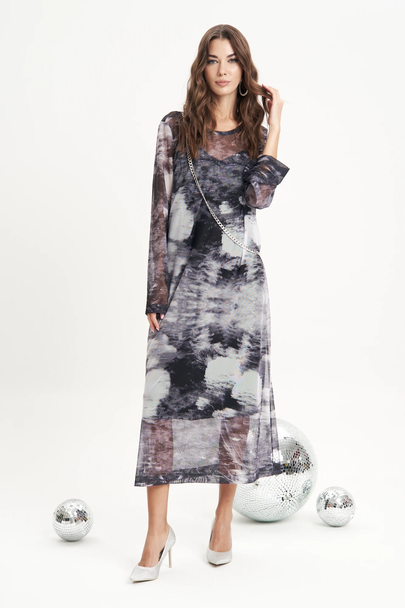 Платье из сетки сегодня стало одним из самых популярных в мире моды.Выполнено из мелкой матовой сетки с оригинальным дизайнерским принтом-такое платье станет отличной альтернативой вязанным и кружевным нарядам - лёгкое, струящееся, соблазнительное.Наше платье простое по покрою-может быть вполне праздничным, если подобрать к нему аксессуары и обувь.Отлично вписывается оно и в ежедневный гардероб, позволяя собирать новые интересные и стильные образы.Платье прямого силуэта с втачными длинными слегка расширенными к низу рукавами .Вырез горловины красивой овальной форм.Перед и спинка платья-на мягкой трикотажной подкладке черного цвета. Цепочка в комплект не входит.Длина изделия около -128 см.Длина рукава около- 63 см.