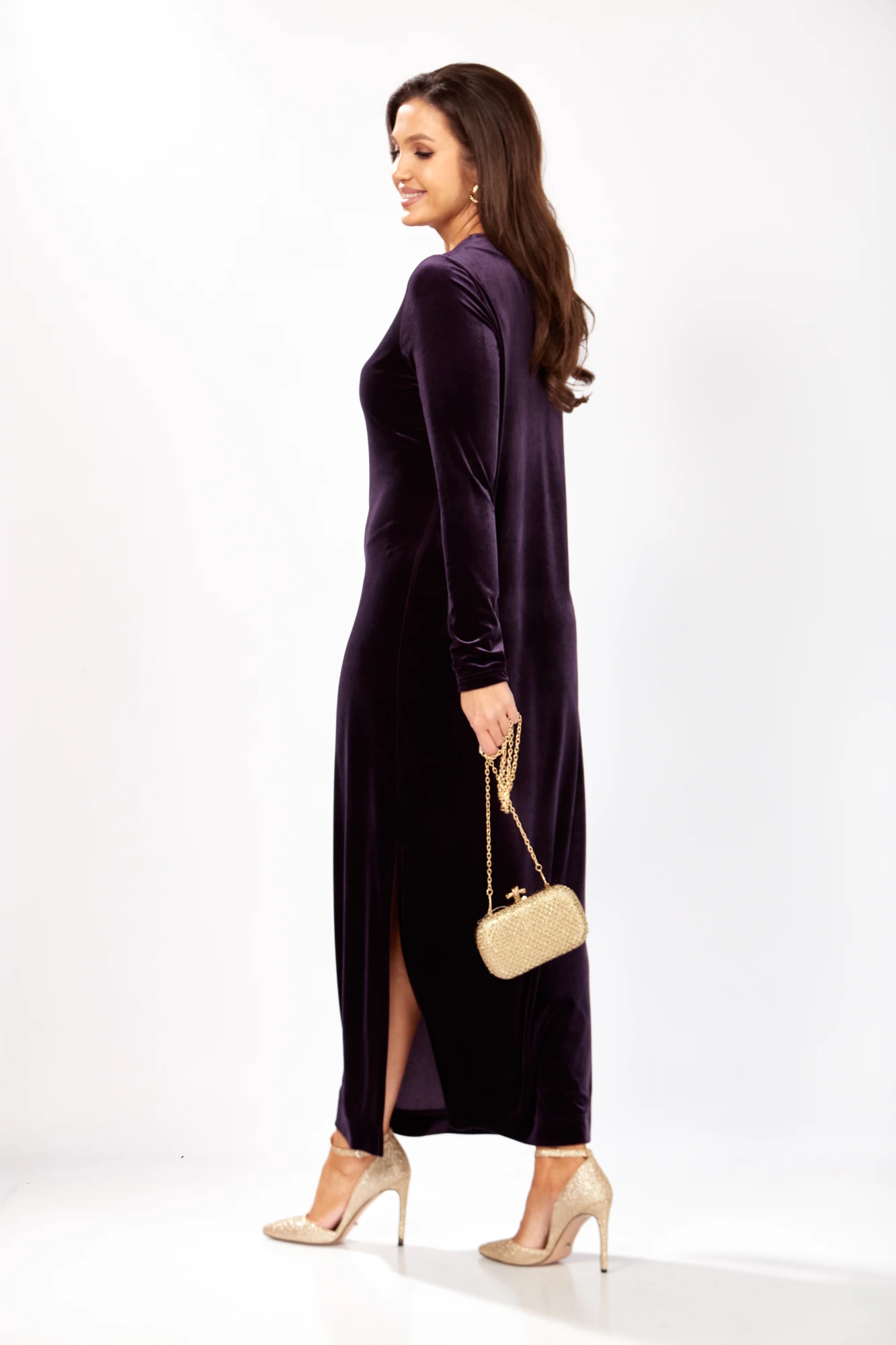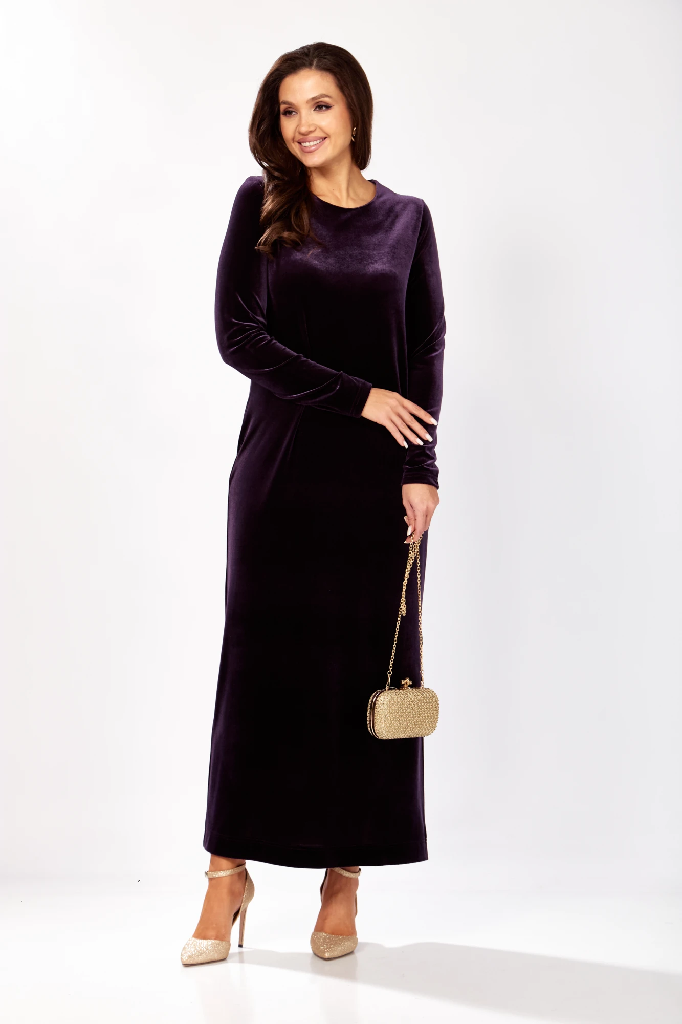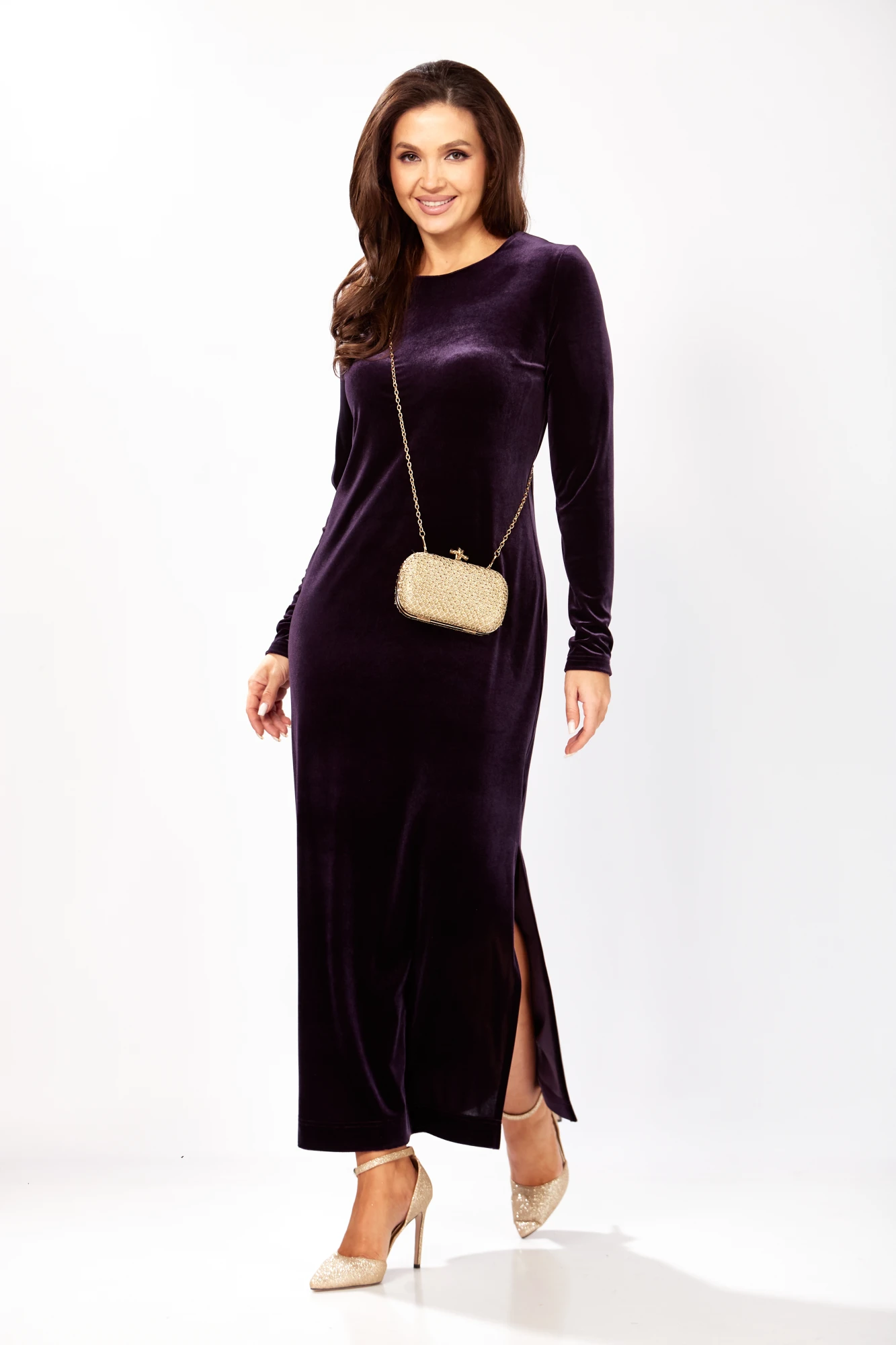 Платье прямого силуэта из бархата. В боковом шве разрез. Рукав втачной одношовный. По спинке застежка капелька на петлю и пуговицу. Длина платья - 136 см, длина рукава - 66 см.