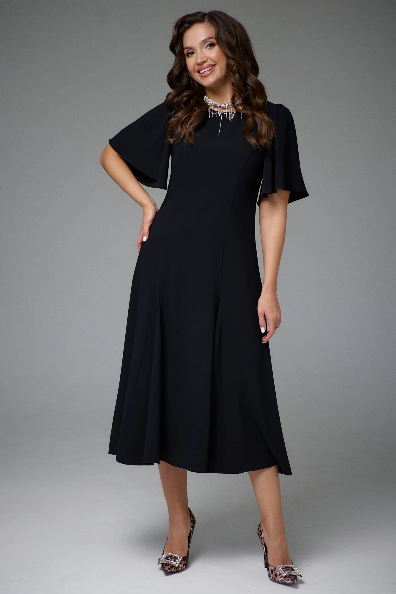 Платье полуприлегающего силуэта с рельефами по переду и спинке. В рельефы вставлены клинья, в боковой шов - потайная застёжка-молния. В области горловины спинки вырез-капля с застёжкой на пуговичку. Рукав укороченный, расширенный, со сборкой по откату. Платье на эластичной подкладке.