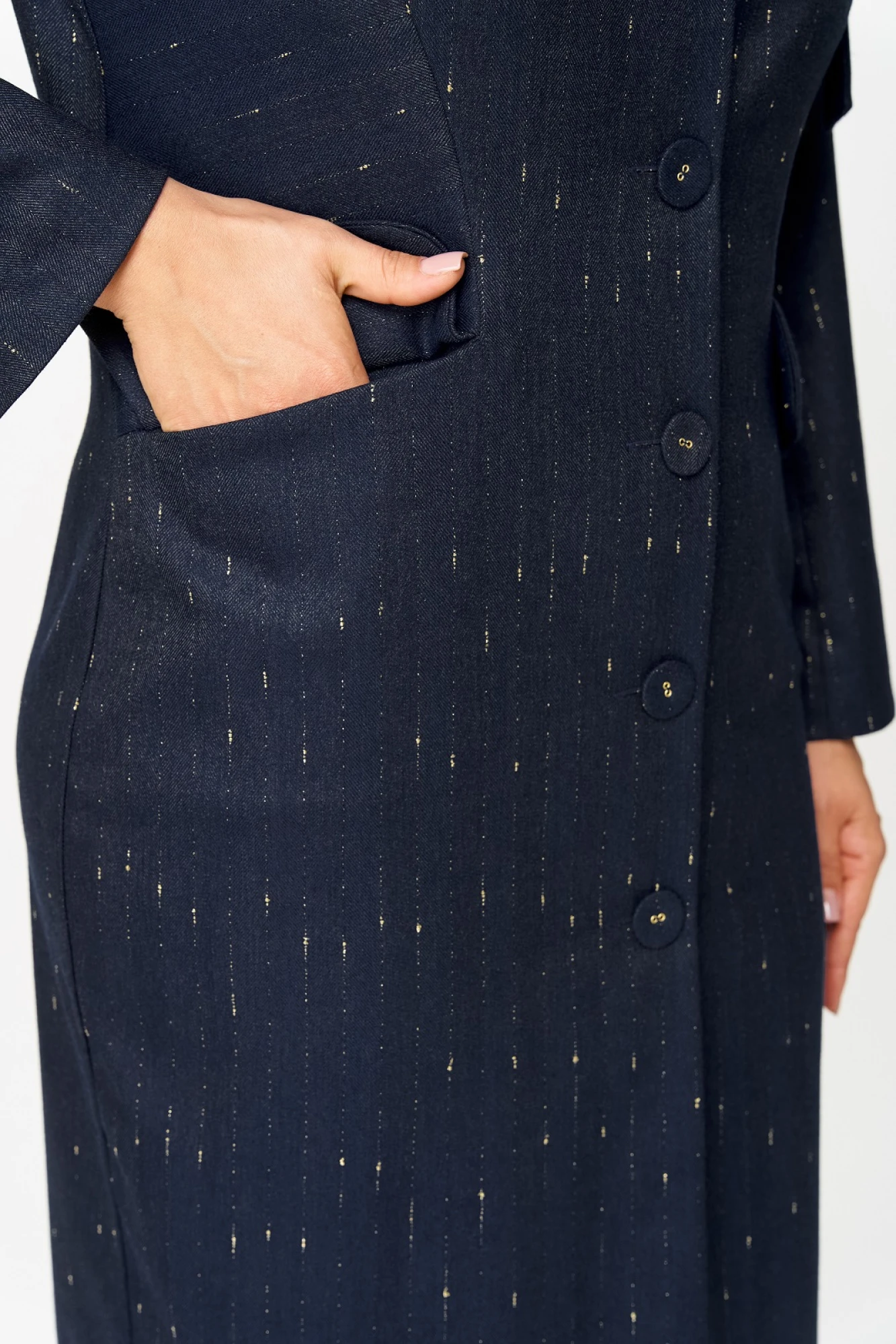 Элегантное женское платье из нарядной плательно-костюмной ткани с добавлением вискозы и метонити. Силуэт полуприлегающий, длина чуть ниже колена, однобортная застежка на обтяжные пуговицы, воротник пиджачного типа, по переду прорезные карманы с клапанами, по спинке в среднем шве шлица, рукав длинный. Особый шарм платью придает съемное украшение - цветок из основной ткани.