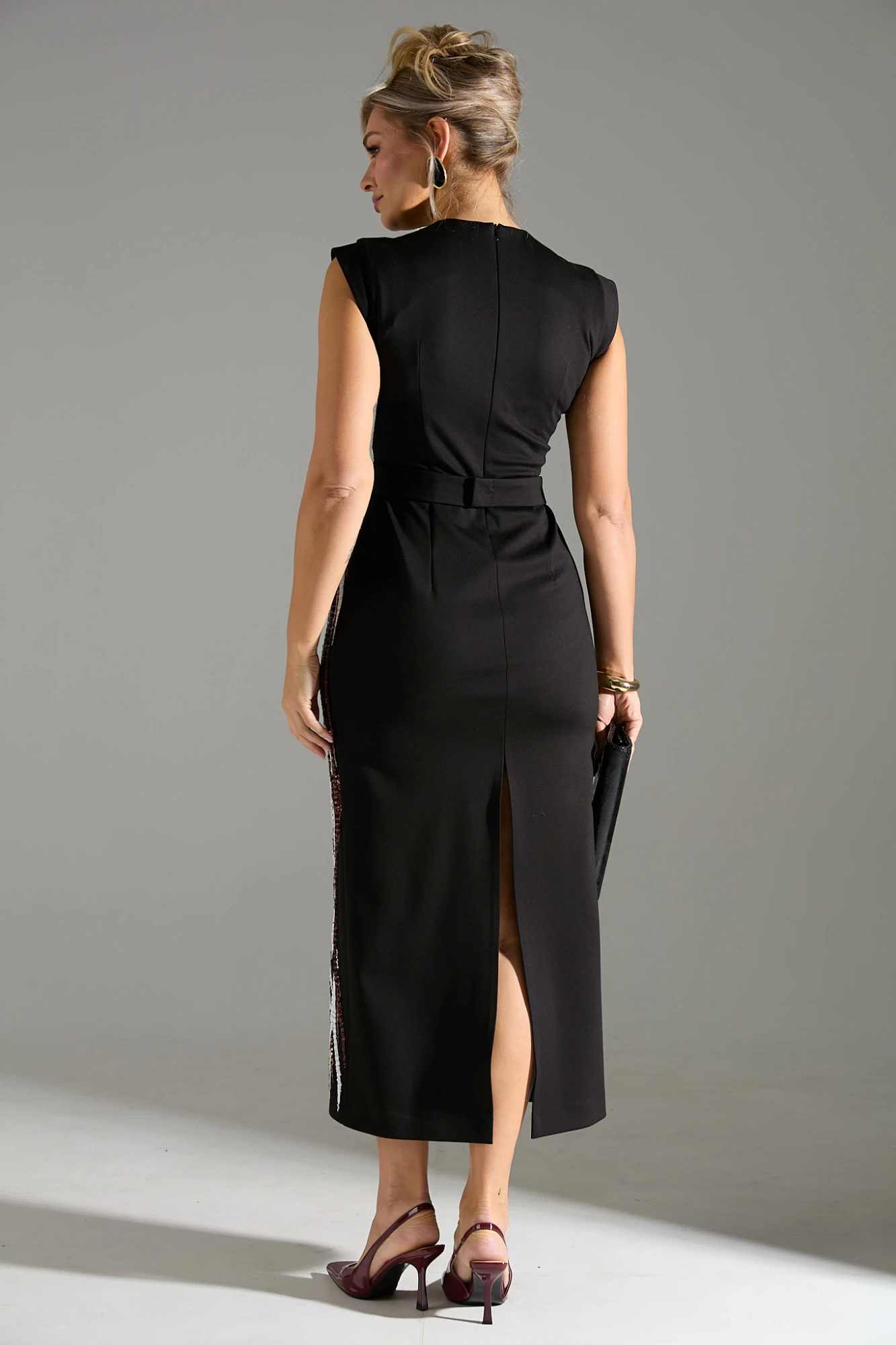 "Платье приталенного силуэта выполнено из плотного трикотажного полотна. Перед платья декорирован сеткой с вышивкой из пайеток. По спинке расположены талиевые вытачки. По среднему шву спинки разрез длинной 56 см и застежка на потайную молнию. Горловина и пройма обтачные, рукав выполнен в виде небольшого ""крылышка"".
