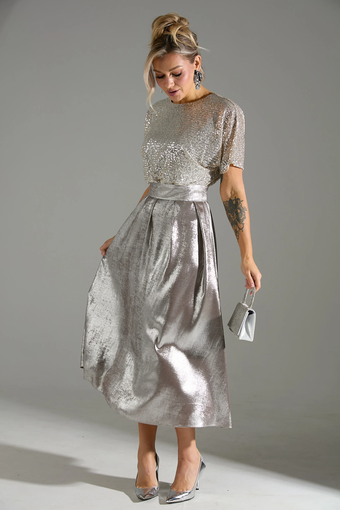 Платье длины "миди" с объёмной юбкой. Верх платья выполнен из ткани расшитой пайетками. Застежка на потайную молнию по среднему шву спинки. В комплекте идет длинный съемный пояс. На юбке по линии талии заложены складки.