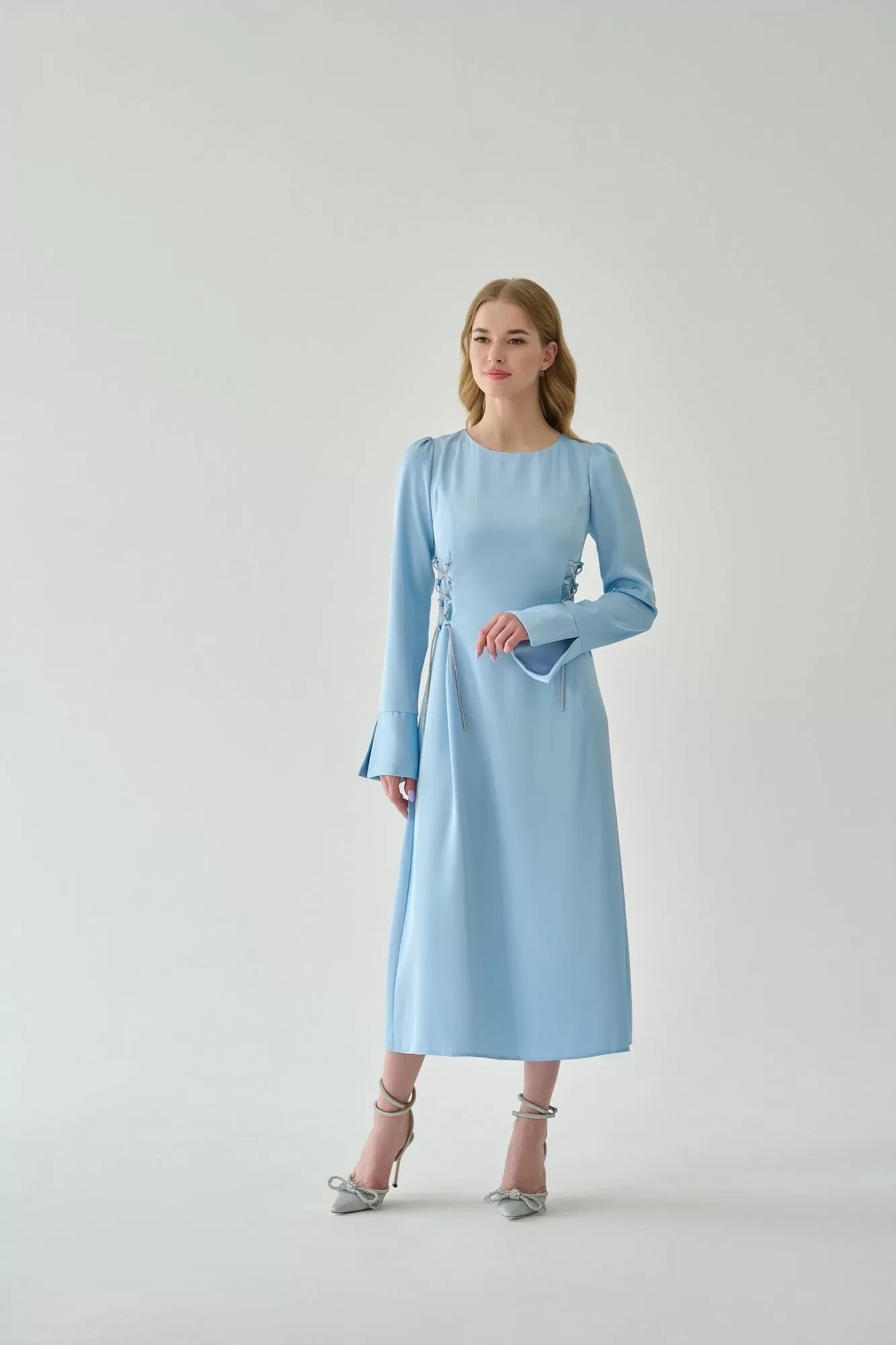 Рельефные швы формируют приталенный силуэт, деликатно повторяют естественные изгибы тела. Шнуровка по бокам обеспечивает идеальную посадку по фигуре, так как даёт возможность регулировать ширину платья. Для удобства в среднем шве спинки предусмотрена потайная молния длиной 50см. Круглая горловина, втачной длинный рукав, который заканчивается притачным манжетом с кокетливым разрезом, сборка по окату рукава, длина миди - всё это делает наше платье очень нежным и романтичным. А особый шарм придают фактурная ткань атласного переплетения и акцентный шнур со стразами.