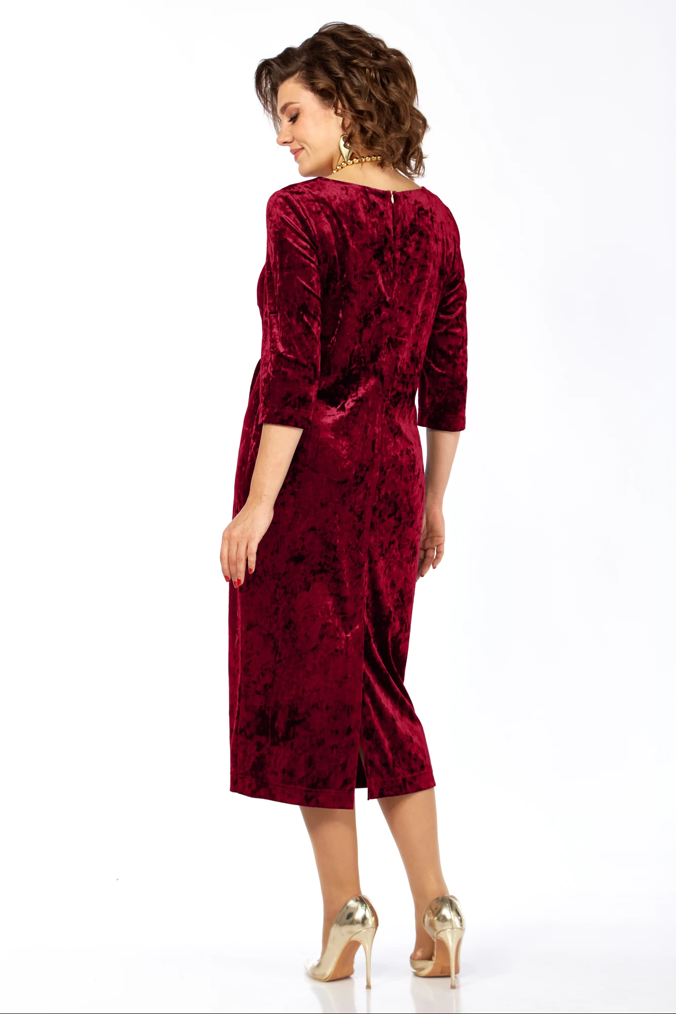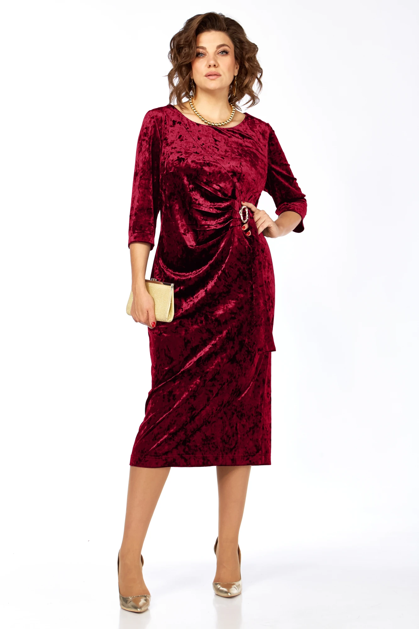 Платье женское, выполнено из бархатного полотна, длиной миди. Спинка со средним швом, шлицей на движение и потайной тесьмой-молнией. Перед с нагрудными вытачками из боковых швов, округлым вырезом горловины, и подрезом от правого плеча. Правая деталь переда присобирается в драпировку в области талии и закреплена декоративной пряжкой. Рукав втачной одношовный, длиной 3/4.