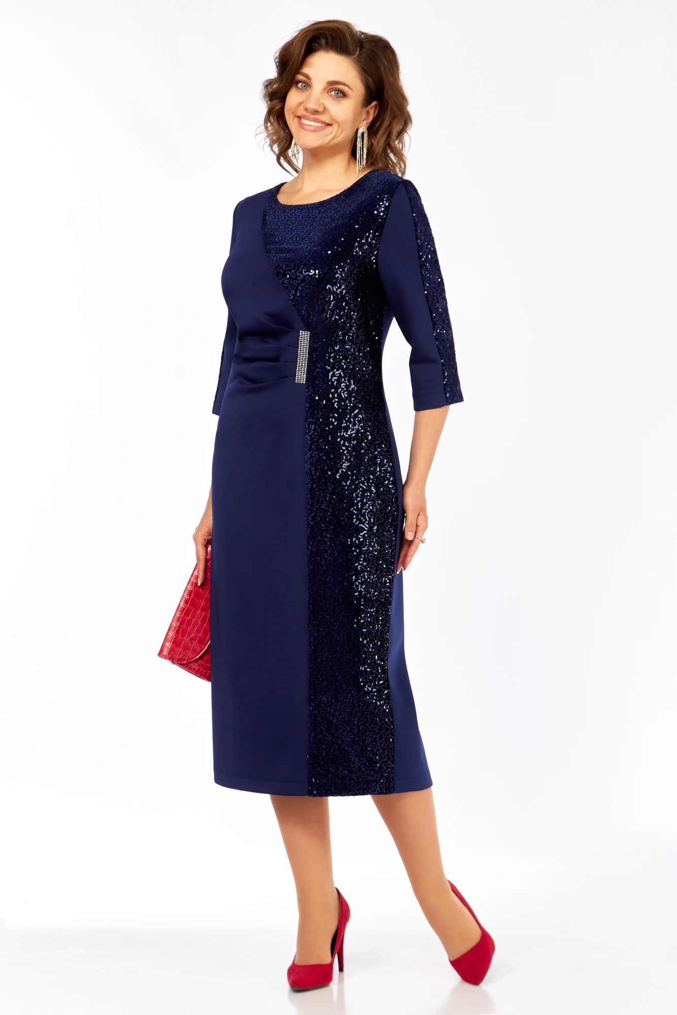 Платье женское, выполнено из 2-х видов тканей, длиной миди. Спинка со средним швом, шлицей на движение и потайной тесьмой-молнией. Перед с нагрудными вытачками из боковых швов, округлым вырезом горловины, и подрезом от правого плеча. Правая деталь переда присобирается в драпировку в области талии. Левая деталь переда из отделочной ткани- бархата с пайетками. Рукав втачной одношовный, длиной 3/4, с лампасом из отделочной ткани.