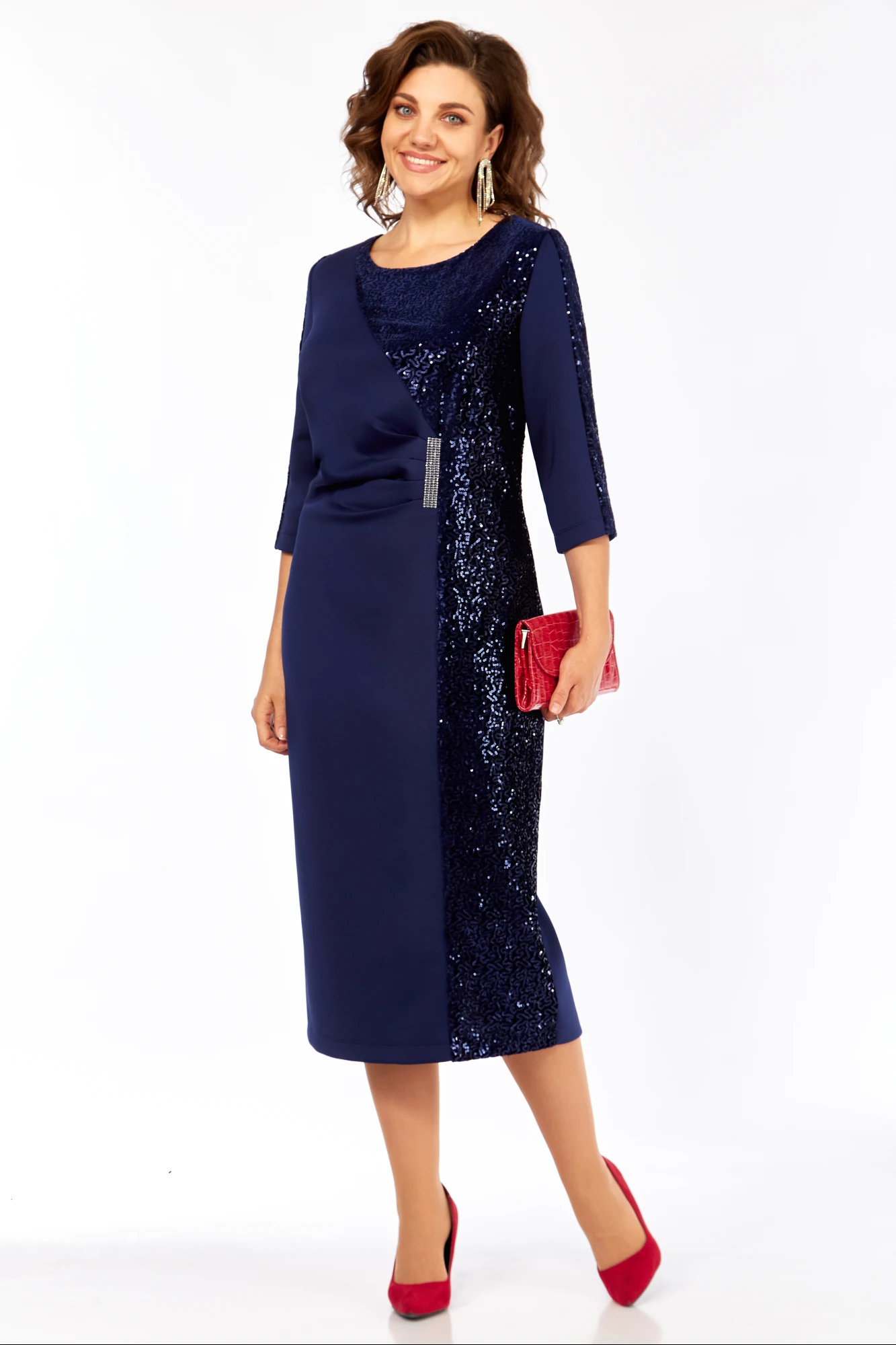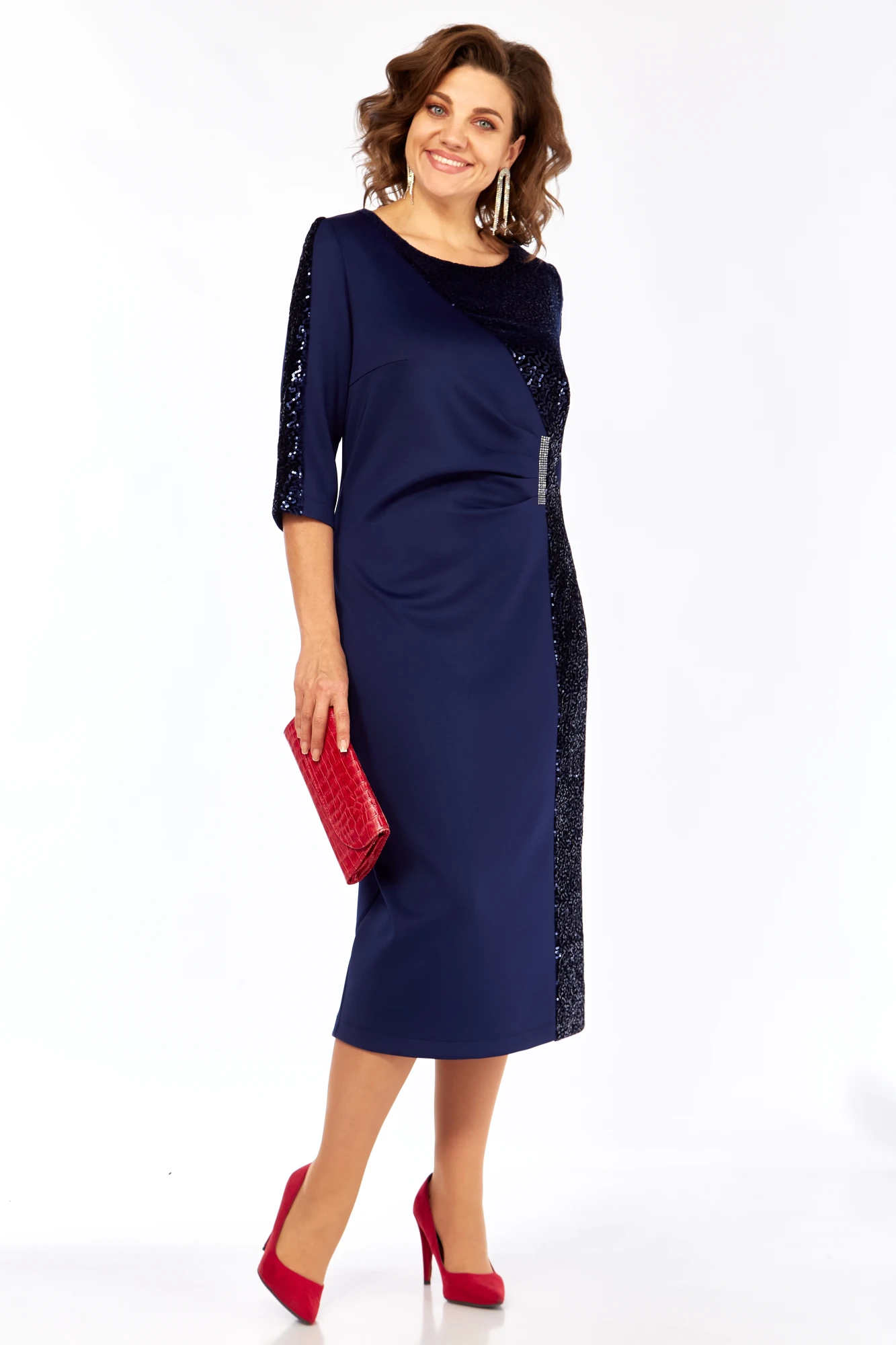 Платье женское, выполнено из 2-х видов тканей, длиной миди. Спинка со средним швом, шлицей на движение и потайной тесьмой-молнией. Перед с нагрудными вытачками из боковых швов, округлым вырезом горловины, и подрезом от правого плеча. Правая деталь переда присобирается в драпировку в области талии. Левая деталь переда из отделочной ткани- бархата с пайетками. Рукав втачной одношовный, длиной 3/4, с лампасом из отделочной ткани.