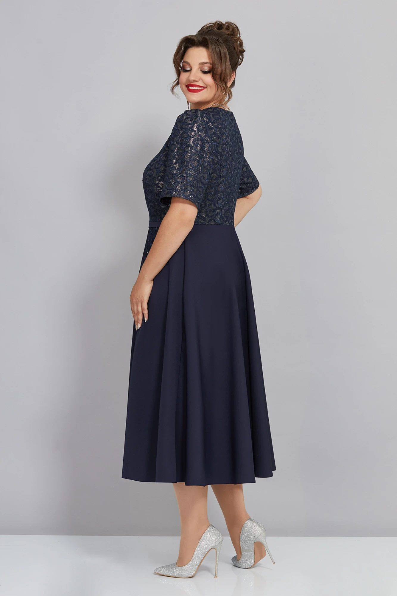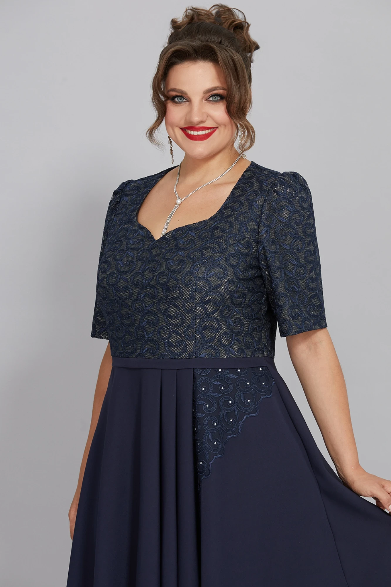 Нарядное женское платье, полу-прилегающего силуэта, выполнено из текстиля и кружева. Лиф платья отрезной по линии талии, выполнен из кружева на подложке из серебра. Горловина платья фигурной формы, на обтачке, также на лифе обработаны рельефы, по линии талии декоративный пояс из однотонной ткани. Рукав втачной, длиной 3/4, выполнен из кружева. Юбка платья расклешенная, с складками по линии талии и аппликацией, декорированной стразами. Спинка идентична полочке, отрезная по линии талии, со средним швом и рельефами, в среднем шве потайная молния. Эффектно, нарядное платье отличный выбор!