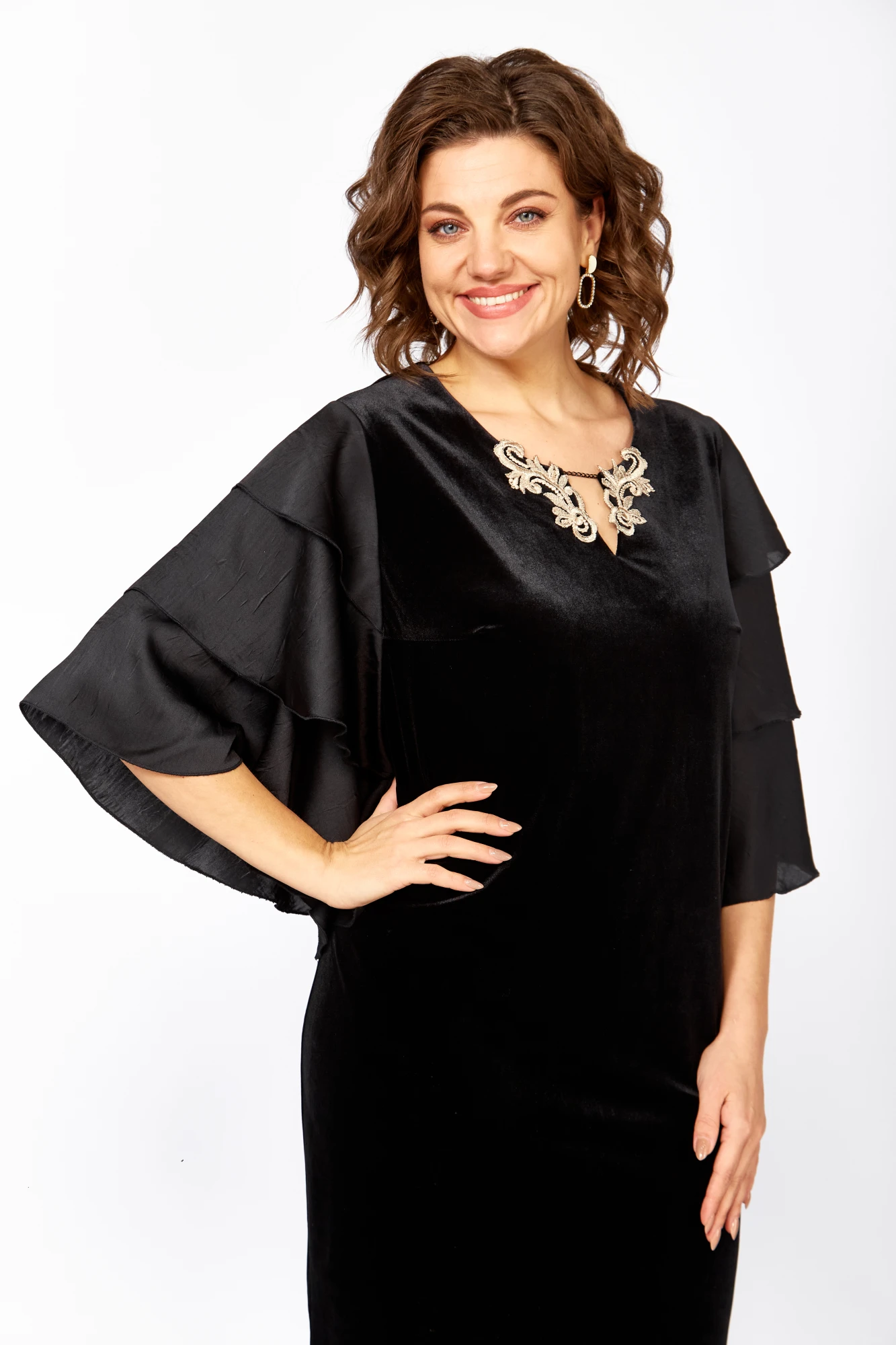 Женское платье полу-прилегающего силуэта, выполнено из велюра и крэш-атласа. Горловина платья округлой формы, на обтачке, декорирована небольшим разрезом и украшена аппликацией и цепочкой. Спинка платья со средним швом и вытачками, выполнена из велюра. Рукав втачной, выполнен из крэш-атласа, состоит из расклешенных воланов в три яруса, что придает платью нарядности. Платье с эффектным кроем рукавов и элегантным декором отличный выбор для любого мероприятия!