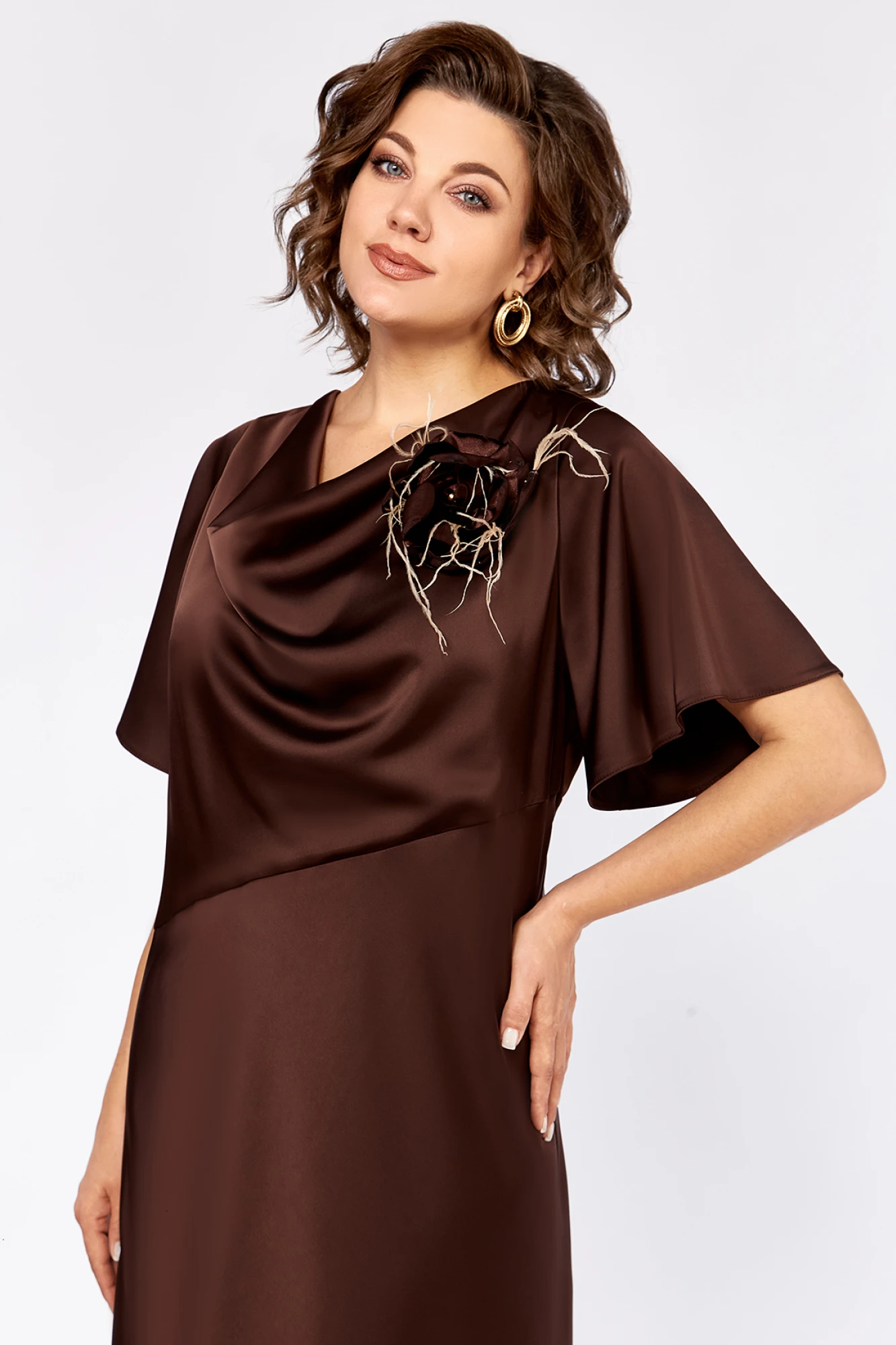 Эффектное, женское платье полу-прилегающего силуэта выполнено из атласа. На полочке выполнены ассиметричные подрезы, горловина свободного покроя-«качели», декорирована съемным цветком. Спинка также с ассиметричными подрезами, рукав втачной, укороченный. Эффектное и стильное платье с ярким декором отличный вариант для любого мероприятия!