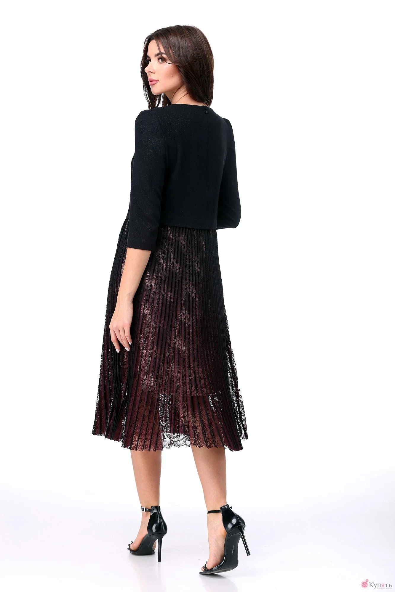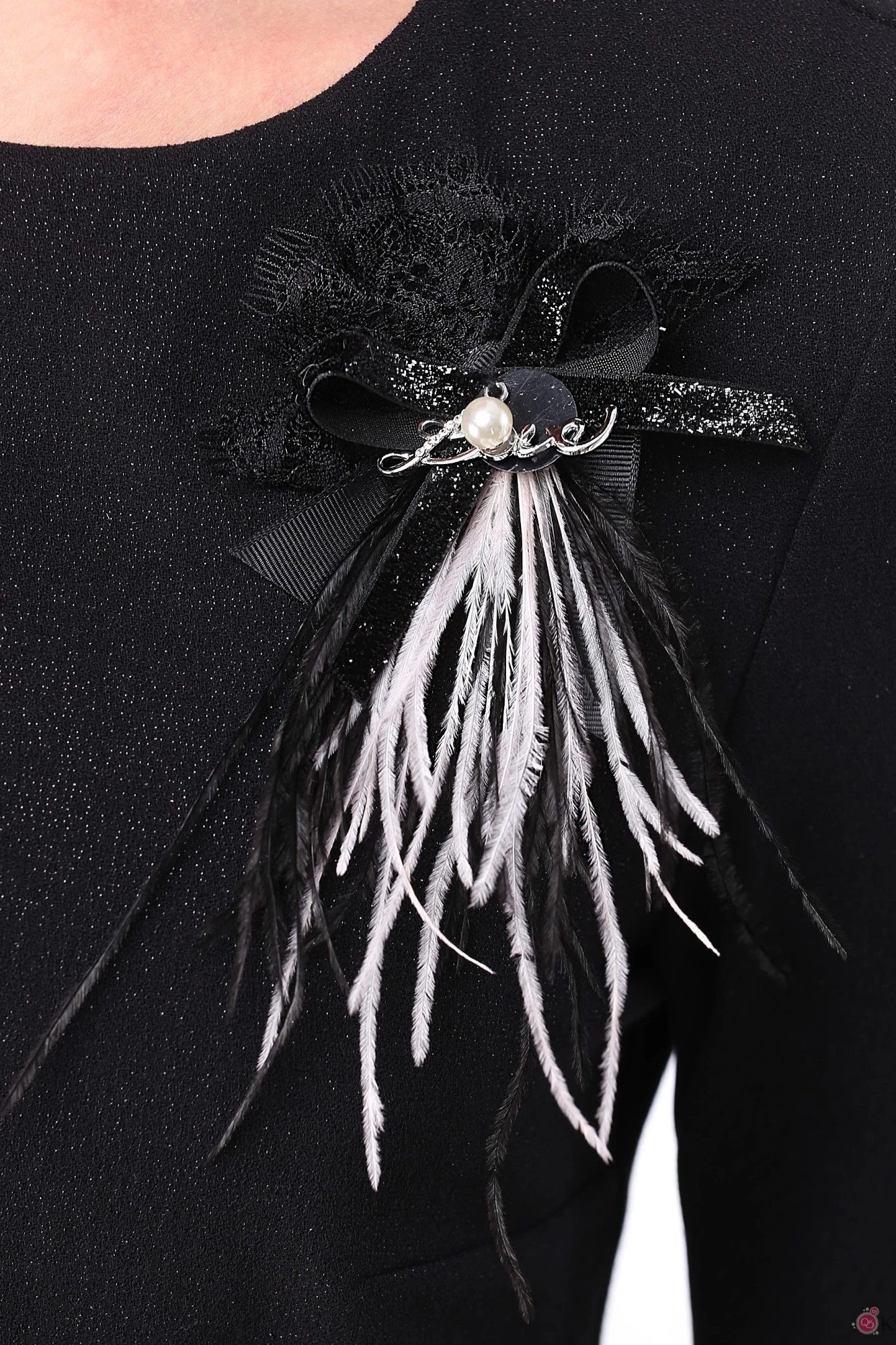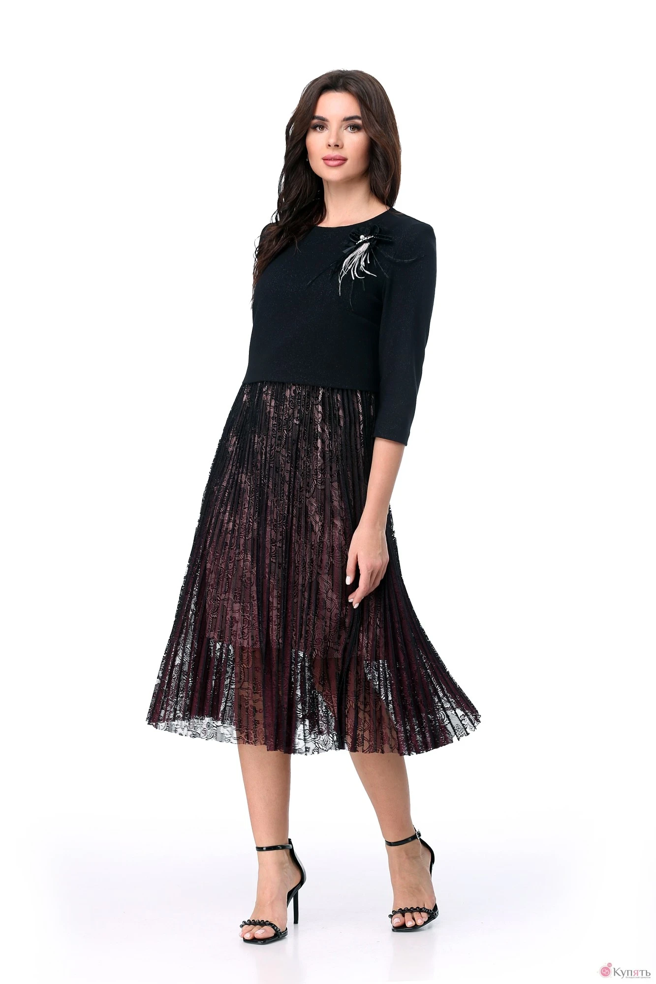 Нарядное платье отрезное по линии талии. Лиф отлетной из костюмно-плательной ткани с добавлением люрекса. Юбка-плиссе выполнена из французского кружева. Спинка с потайной молнией в среднем шве. Рукав втачной ,одношовный 3/4 .Платье дополнено элегантной брошью ручной работы