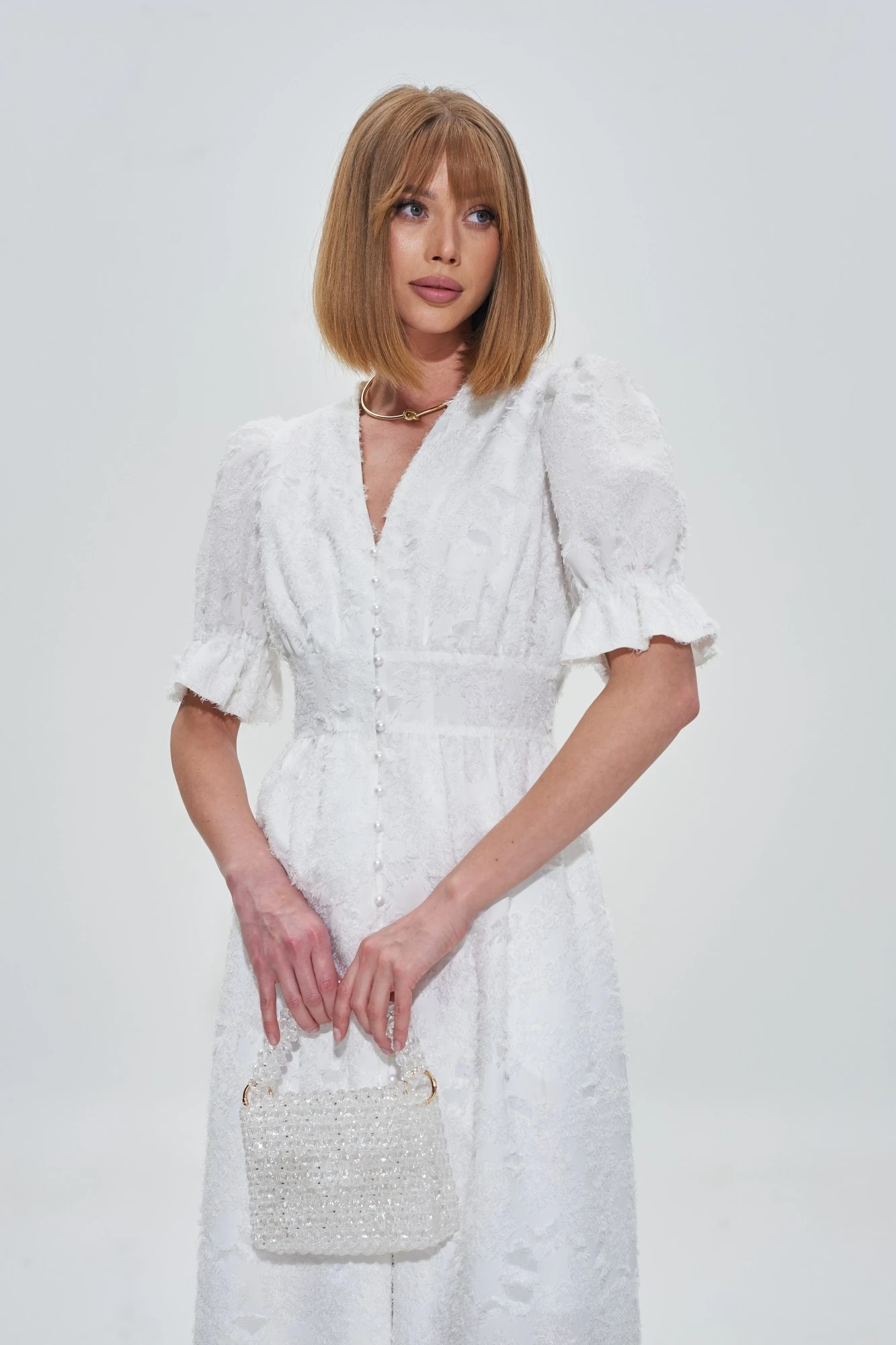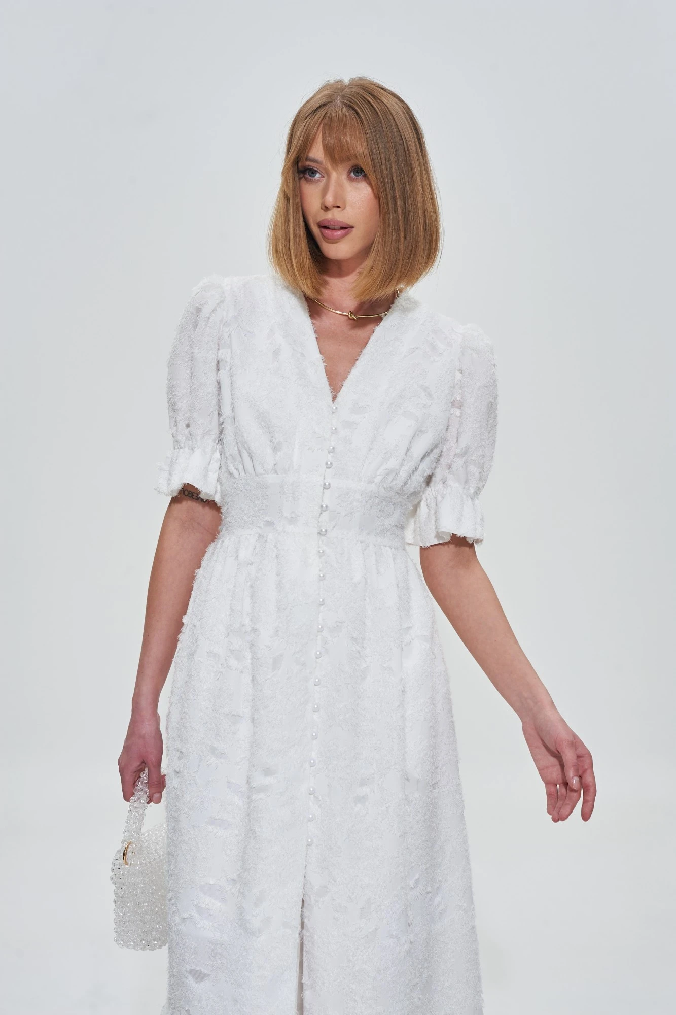 Платье выполнено из премиальной фактурной вискозной ткани с дизайнерским переплетением нитей. Платье с застежкой на пуговицы, отрезное по линии талии. Платье прекрасно подчеркнет ваши достоинства! И вы можете быть уверены, что больше никто не придет на праздни к в таком же платье!