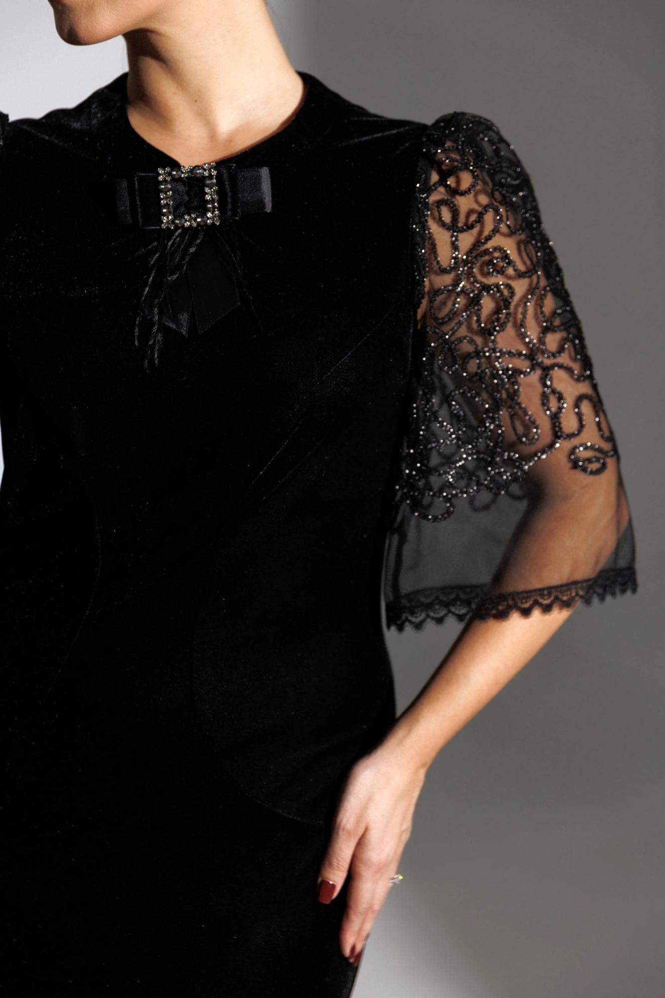 Новинка от бренда Мода-Юрс - велюровое платье в тандеме с гипюром. Черный цвет в одежде - символ утонченности и роскоши. Платье подчеркивает женственные линии фигуры и не оставит шанса не влюбиться! Платье полуприлегающего силуэта с рельефами по переду и талиевыми вытачками по спинке. Рукав втачной, по окату со сборкой, к низу расширен. По переду платье со стойкой, которая застегивается на навесную петлю и пуговицу и на крючок внутри.