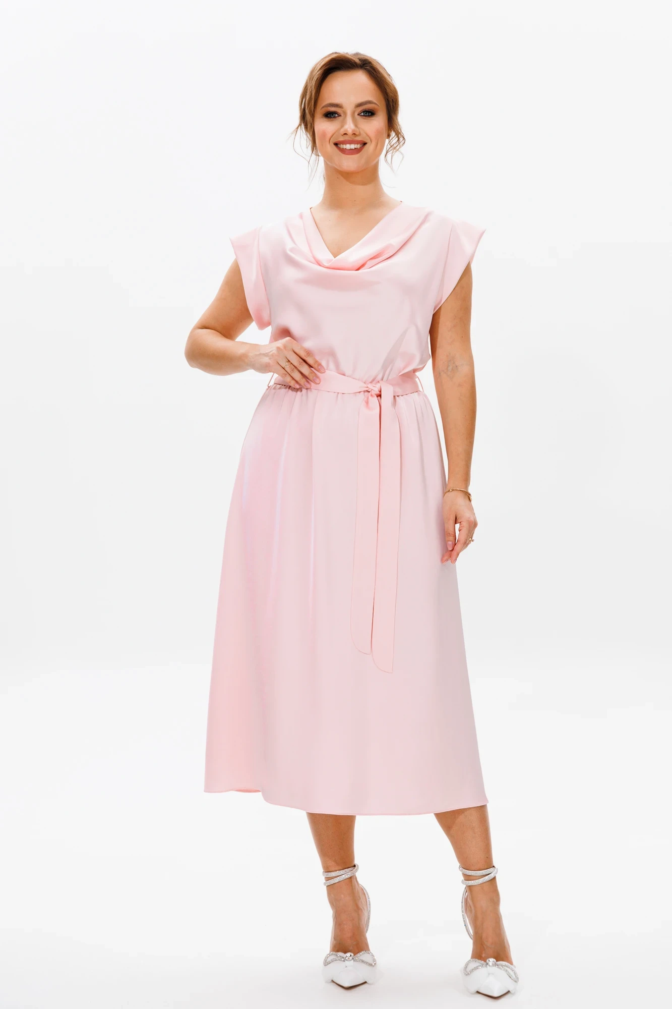 Нарядное женское платье, выполнено из легкого струящегося атласа (тянется). Платье отрезное по линии талии, присборенное резинкой. Верхняя часть платья прямого силуэта. Горловина переда оформлена драпировкой «качели», горловина спинки обработана окантовкой. Рукава в платье в виде притачной манжеты. Нижняя часть платья – покроя полусолнце. В комплект входит пояс из основной ткани.