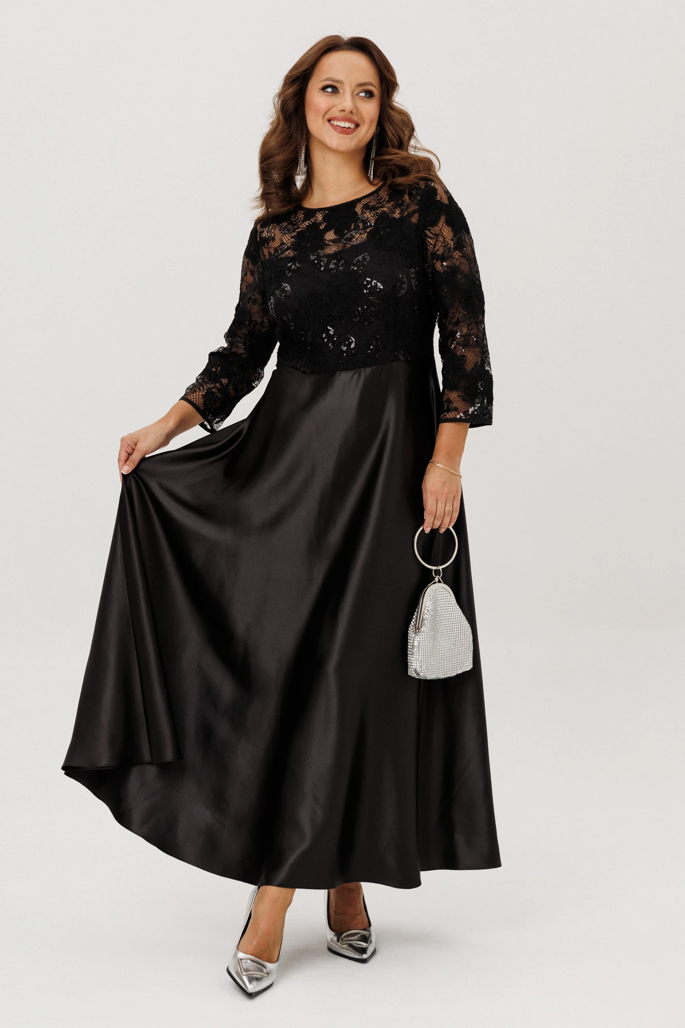 Нарядное женское платье отрезное по линии талии. Верхняя часть выполнена из гипюра с вышивкой и пайетками (не тянется), нижняя часть из плательного шелка «Армани» (немного тянется). По лифу переда – талиевые вытачки. По лифу спинки средний шов и потайная застежка-молния. По лифу переда и спинки – подкладка (немного тянется). Горловина округлой формы, обработана окантовкой. Рукава втачные, одношовные, по низу обработаны окантовкой. Нижняя часть платья – «полусолнце» по спинке со средним швом.
