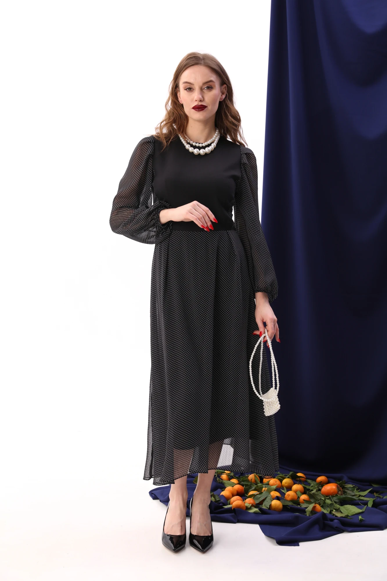 Вечернее платье с шифоном NikVa 416-7 черный/белый горошек
