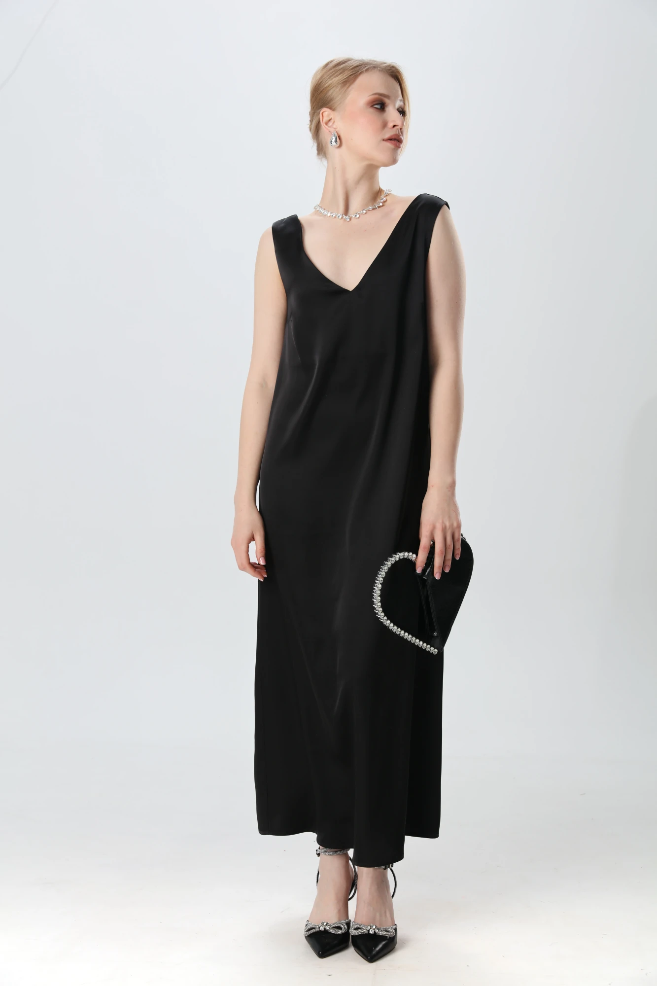 Платье прямого силуэта, с небольшим расширением к низу, длиной макси. Перед с нагрудной вытачкой из бокового шва. Вырез горловины переда и спинки имеют V-образную форму.