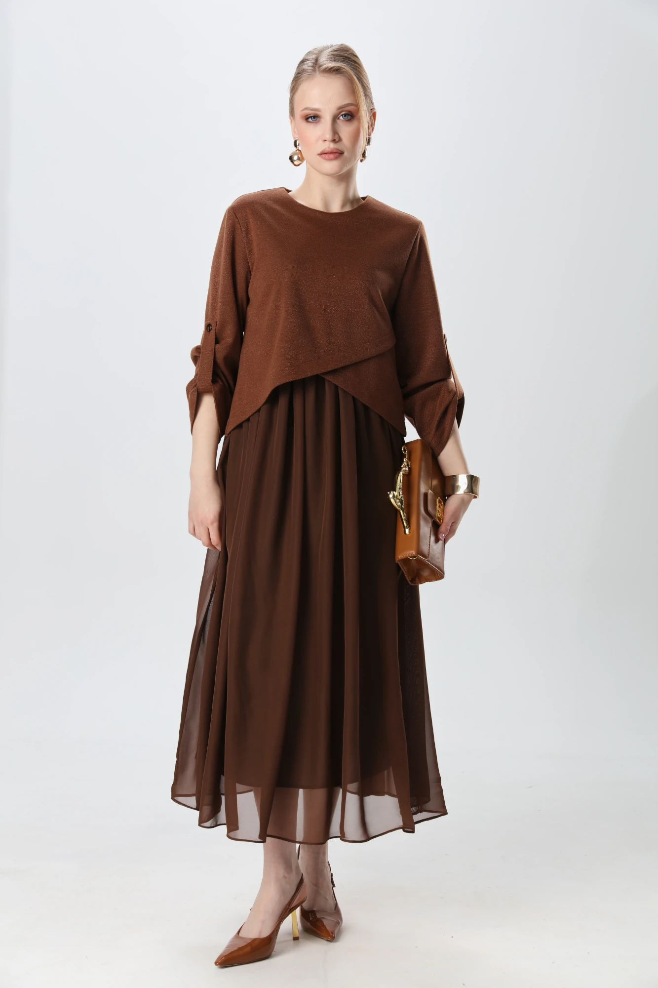 Платье макси комбинированное, двухцветное. Лиф фигурный по низу. Вырез горловины полукруглый, по спинке затежка на молнию. Рукава втачные на патах. Юбка на резинке, драпирующаяся, расширенного силуэта из шифона. На подкладке.