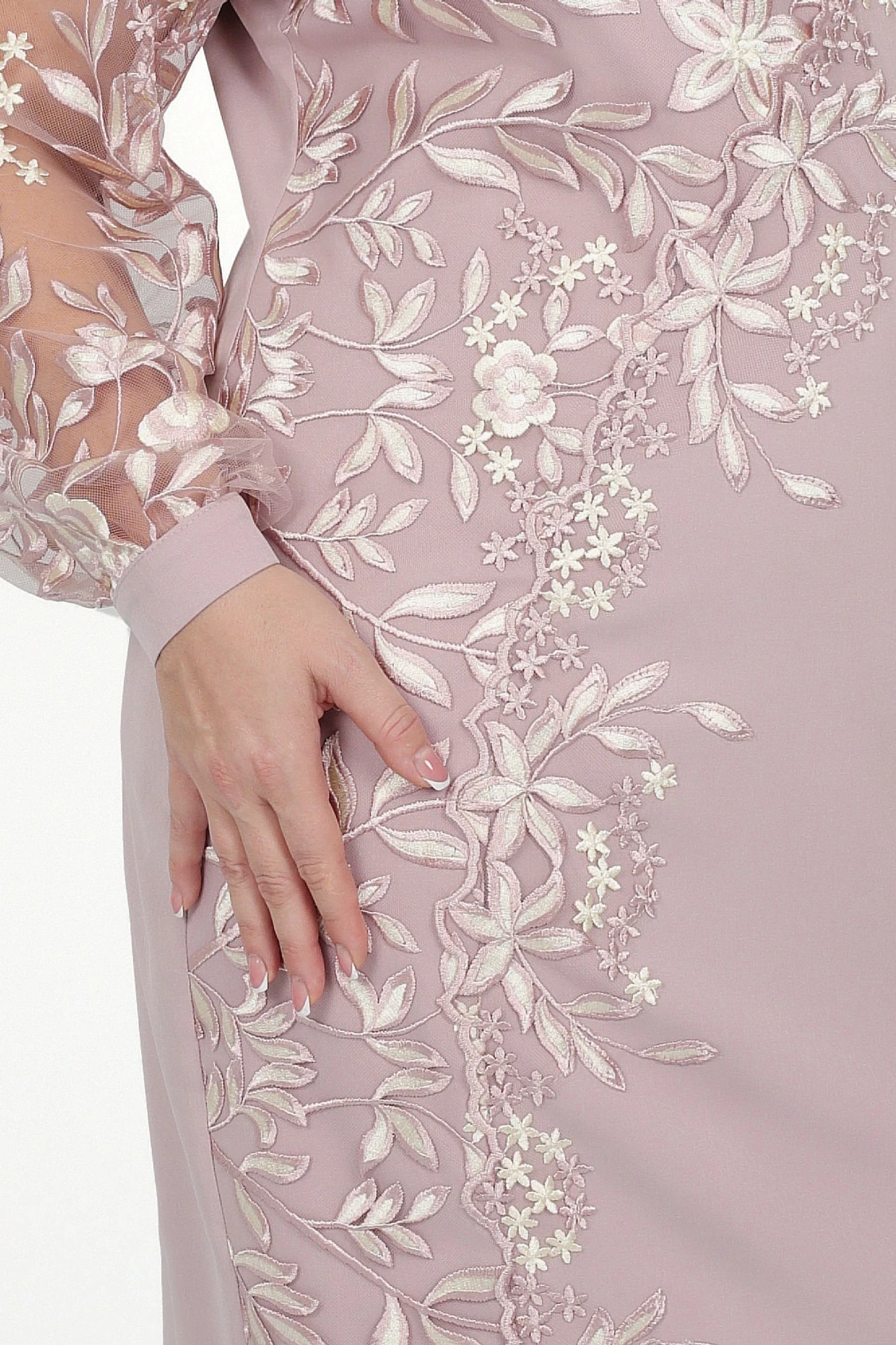 Вечернее платье с настроченным итальянским кружевом — воплощение непревзойденной элегантности. Каждая деталь этого наряда, начиная от изысканного кружева на передней части и продолжая кружевными рукавами, излучает утонченность и стиль. Длина миди добавляет образу умиротворенной грациозности.