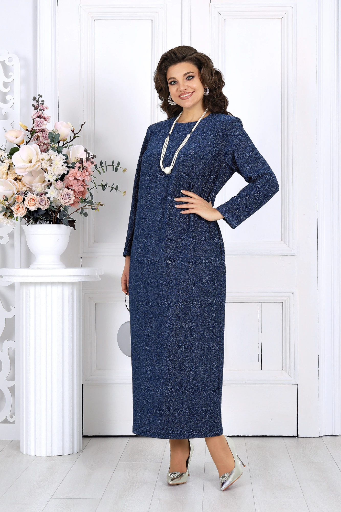 Это платье станет прекрасным выбором для вечерних мероприятий, деловых встреч или особых случаев, когда хочется быть уверенной в себе и выглядеть восхитительно. Выполненное из трикотажного полотна с изысканной фактурой и блеском люрекса, оно привлекает взгляд и подчеркивает вашу индивидуальность. Воротник и манжеты легко снимаются, превращая платье из нарядного вечернего в более повседневный вариант.