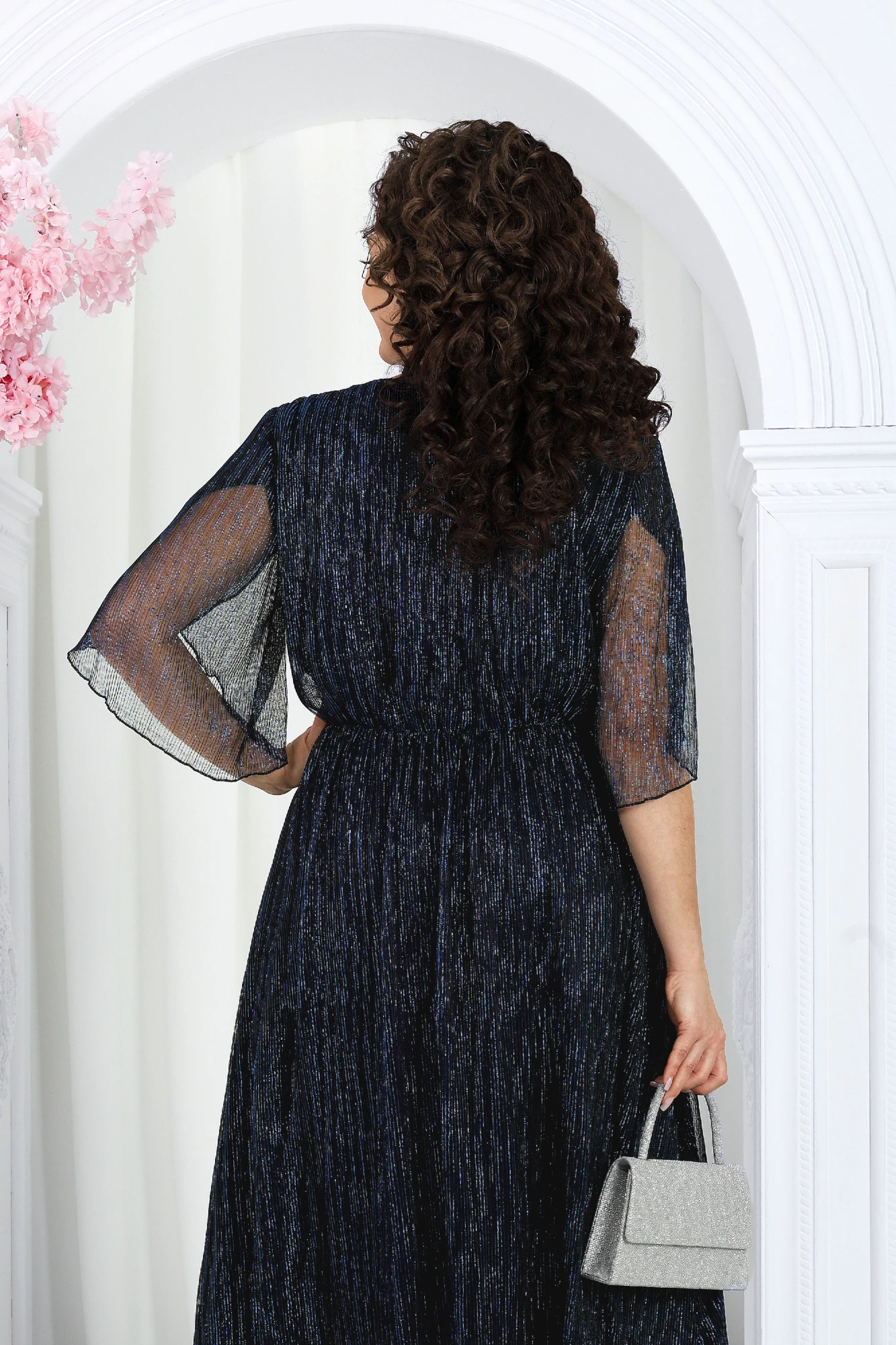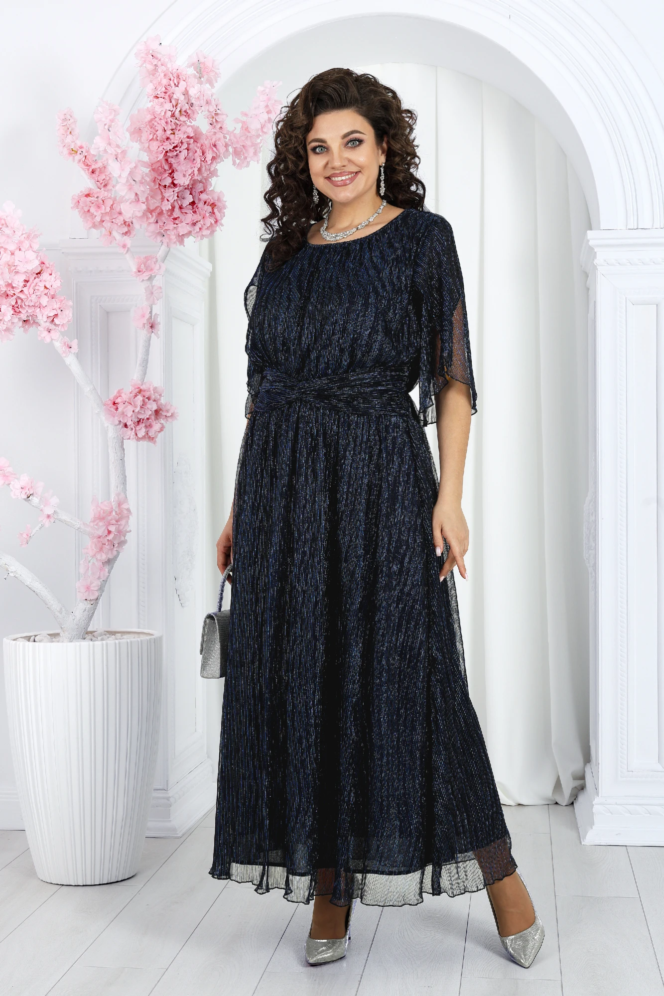 Это изысканное платье приталенного силуэта выполнено из благородной сетки-гофре с мерцающим люрексом, придающим образу праздничное сияние. Трикотажная подкладка обеспечивает комфорт, а отсутствие застежек делает модель удобной и практичной. Драпированный пояс с элегантным перекрутом акцентирует линию талии и добавляет утонченности. Длина платья идеально подойдёт как для торжественных мероприятий, так и для особых случаев, подчеркивая ваш безупречный стиль. Это платье станет вашим незаменимым спутником на праздниках, вечеринках и романтических встречах. Платье женское, приталенного силуэта, выполнено из сетки-гофре с нитью «люрекс». Модель на трикотажной подкладке, без застежки и плечевых накладок. Платье отрезное по линии талии, с полуприлегающим лифом и расширенной к низу юбкой; для лучшего прилегания в области талии на внутренний шов настрочена узкая эластичная лента. Перед дополнен задрапированным поясом с перекрутом, концы которого входят в боковые швы. По плечевым швам, горловине и подрезу талии – сборка. Горловина округлая, окантована узкой косой бейкой из основного материала. Рукав короткий, расширенный, с фигурным низом, переходящим в разрез, края которого по окату скреплены на запах. Длина платья (от горловины спинки) – 131 см, длина платья (от талии спинки) – 92 см; длина рукава – 30 см.