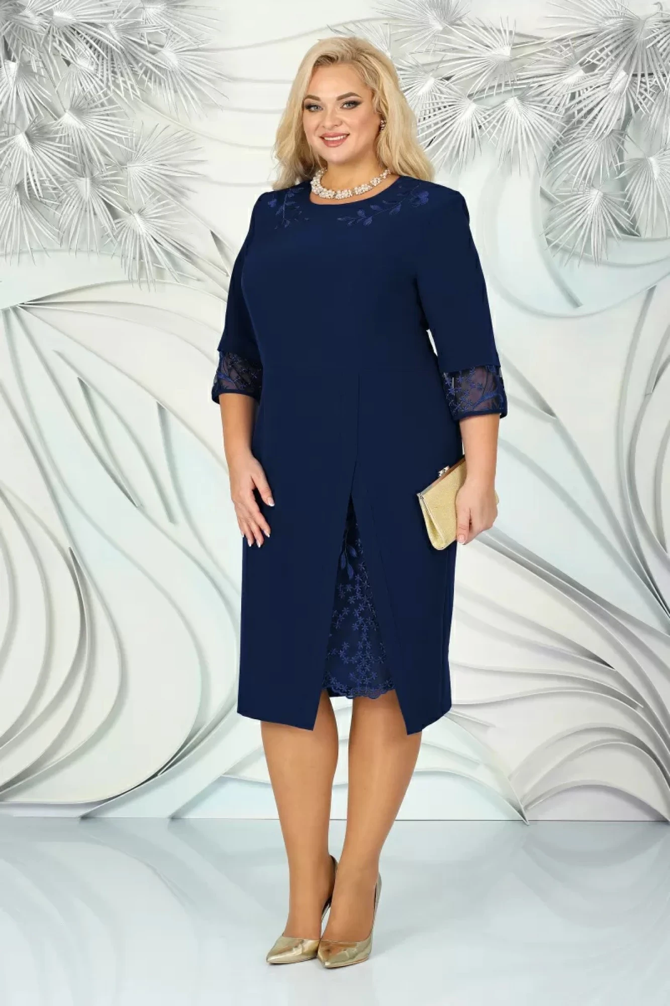 Платье женское, полуприлегающего силуэта, выполнено из костюмно-плательной ткани и гипюра. Длина платья по среднему шву спинки 106 см. Перед платья отрезной по талии. Верхняя часть переда с рельефными швами, проходящими через центр груди и идущими от пройм вниз. От плечевых швов вниз к центру горловины настрочены симметричные аппликации из гипюра. Нижняя часть переда в левой части с ассиметричным разрезом, обработанным планками. В правой части с талиевой вытачкой. В шов подреза на талии вставлена подкладка и деталь из гипюра, которая служит нижней юбкой переда. Низ гипюра оформлен фестонами. Спинка с талиевыми вытачками, со средним швом, в верхней части которого обработана потайная застёжка на тесьму-молнию, в нижней части обработан разрез. Вырез горловины переда и спинки округлый, по переду углубленный. Рукава втачные, одношовные, с широкой подгибкой, к которой пришита нижняя часть рукава из гипюра с окантованным низом. Платье с плечевыми накладками.